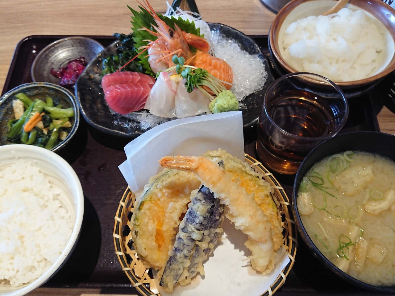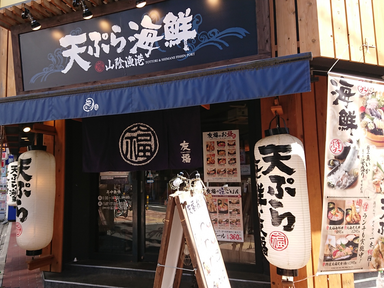 JR高槻駅と阪急高槻駅の間にある天ぷらと海鮮のお店です。ランチに、特選 友福定食(梅)をいただきました。天ぷらはサクサク。鶏天は、子供のげんこつみたいでした。