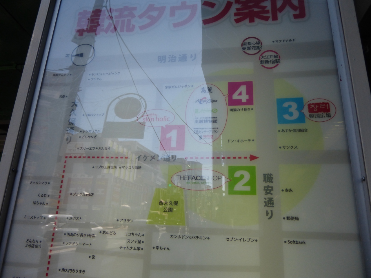韓流スター風の格好の男性も見かけましたし、駅前にあった"韓流タウン案内"という地図には、イケメン通り、と書かれていたのに思わず笑ってしまいました。