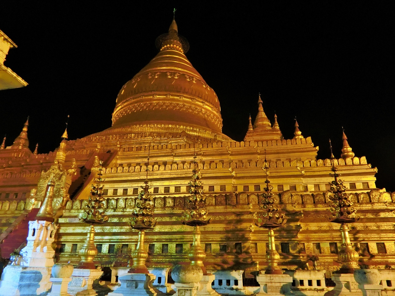場所は、暗くなってからでもシュエジゴンパヤーへ歩いて行ける範囲で、ライトアップが見られます。