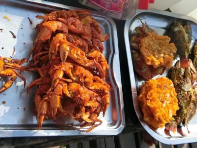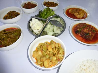友人と、見えているカレーを指さしで1つずつ選ぶと、あれこれたくさんついてきて、お腹いっぱいになりました(選んだのはエビカレーと魚カレー)。選んだカレーがかすむくらいいろいろ出てくるので、女性だとそれで十分だと思います。ハエが入って来てちょっと落ち着きませんが、お味は美味しかったですよ。- 旅行時期