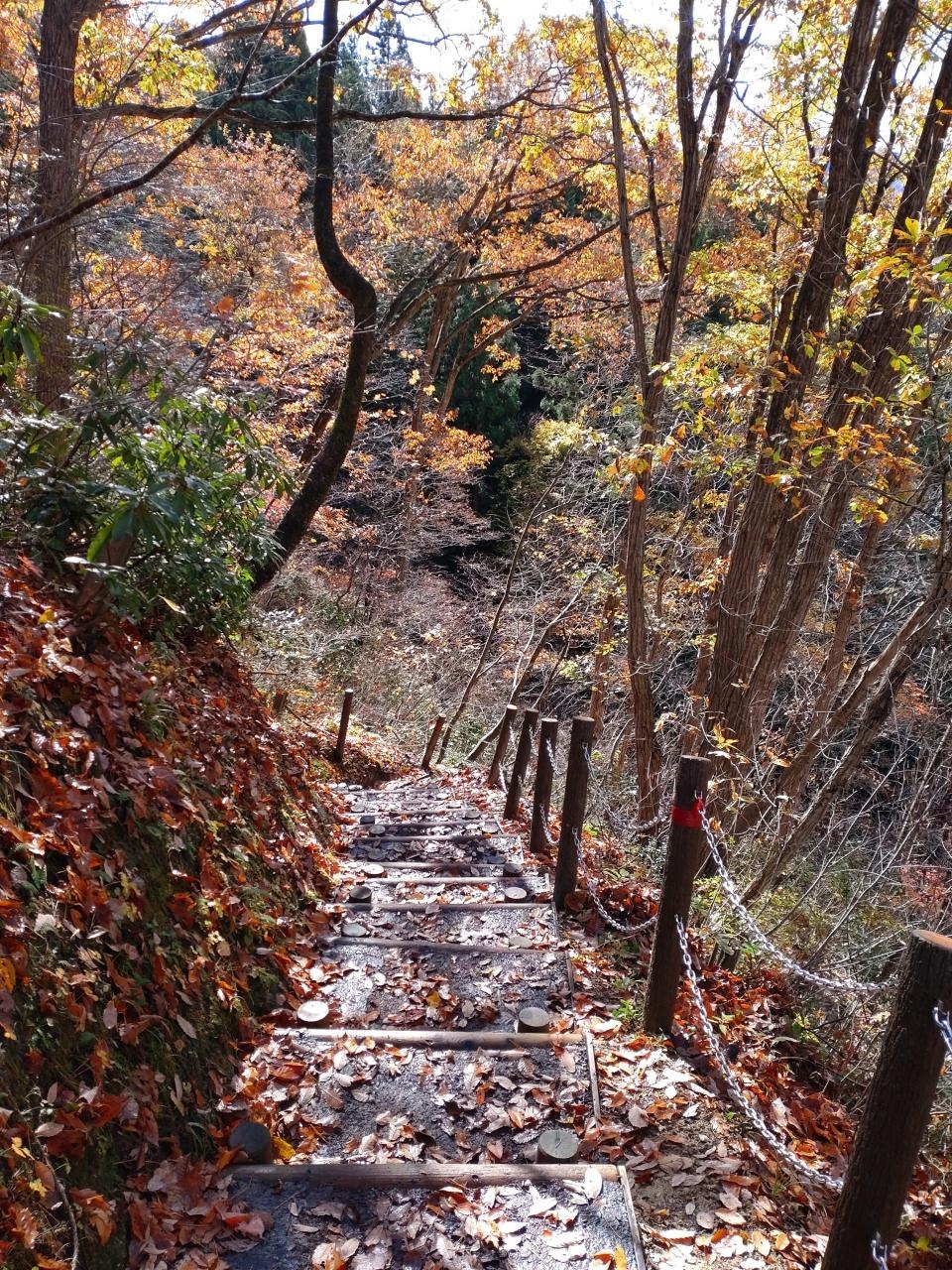 先へ行くには階段を上らなければなりませんが、この階段、一段一段が結構高くて、しかも、秋、しかも雨の日は、濡れた落ち葉で滑る滑る、一番上まで行くには、小柄な私は、息が上がりました。