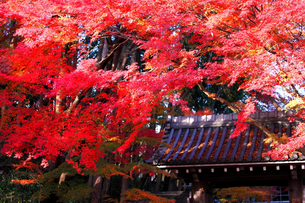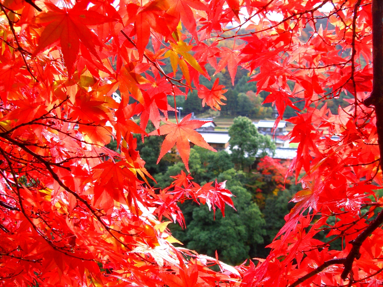 石畳を歩き古びた茅葺の建物に被さる紅葉
