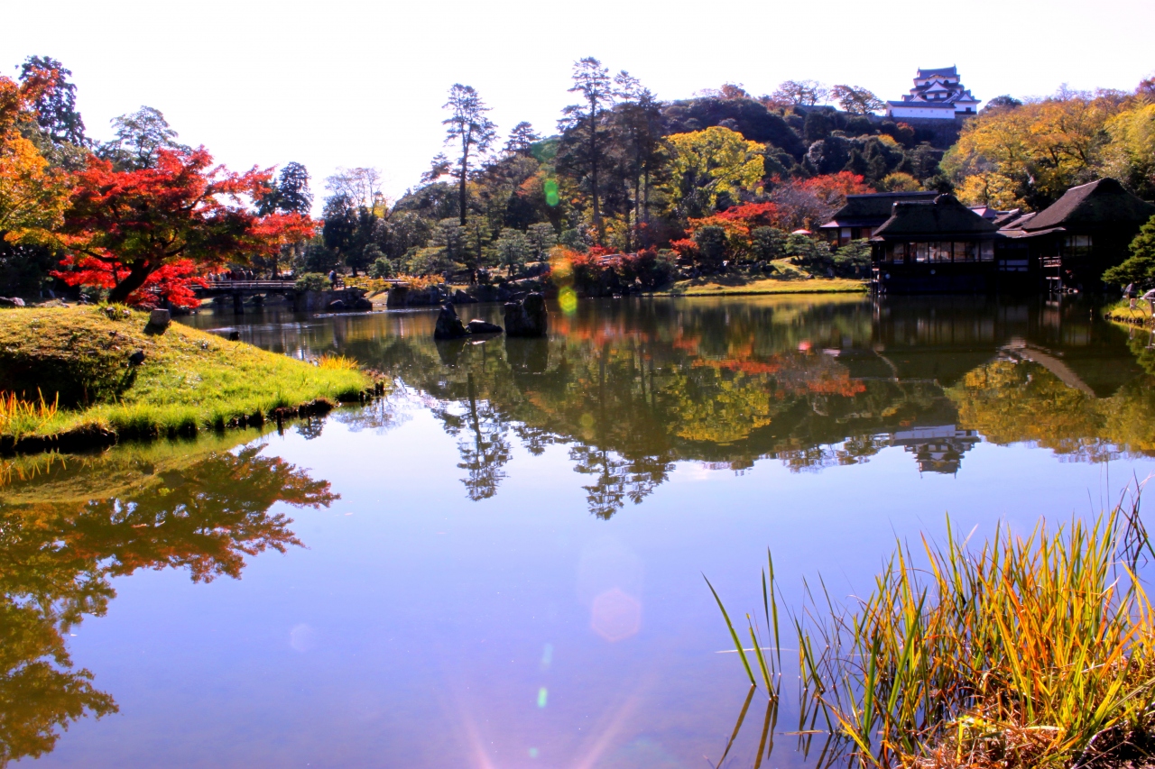 玄宮園は池に映りこむ逆さ天守閣と水鏡が素晴らしい。