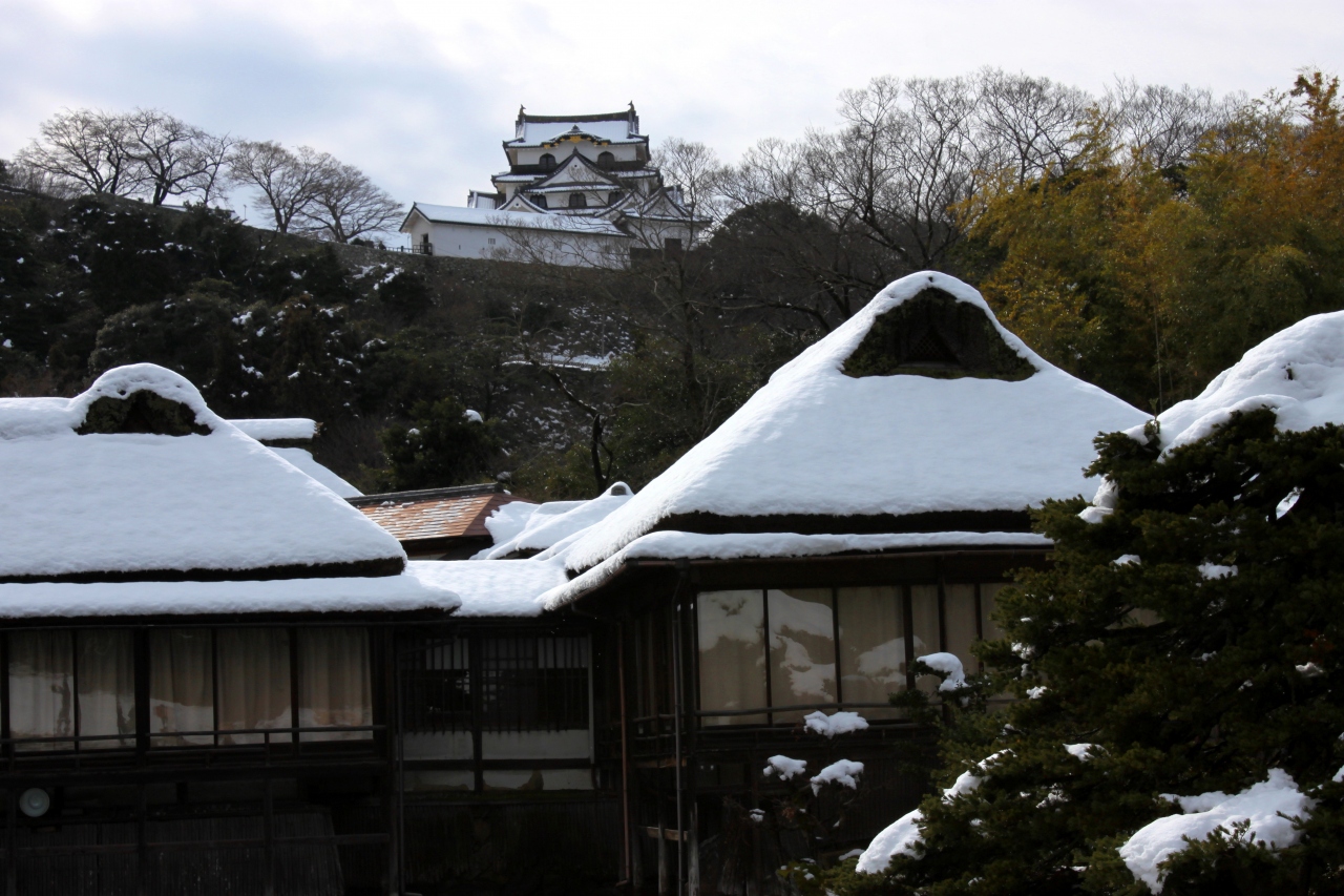 玄宮園の昼間と夜、雪景色、春は桜の木が少ないので