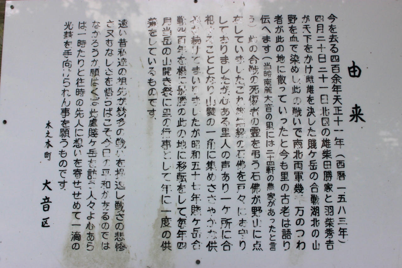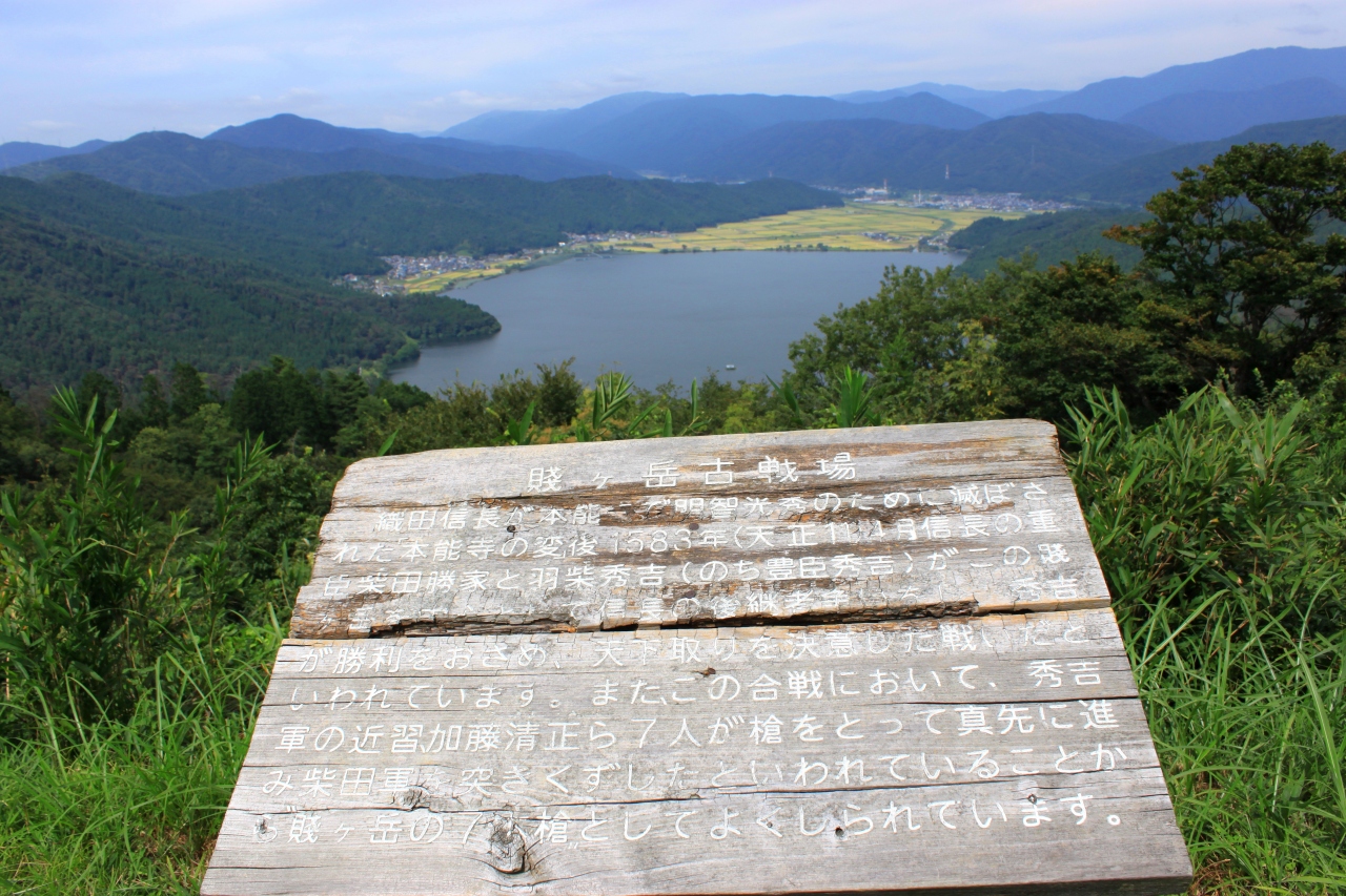 天正11年4月20日賤ヶ岳北側の山から余呉湖畔、柳ヶ瀬方面で決戦が行われ、秀吉はこの勝利により天下人への足がかりを得ることになりました。