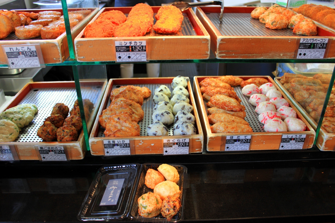 バラエティ色々、食欲そそる種類の揚げたて練り天が並んでます。