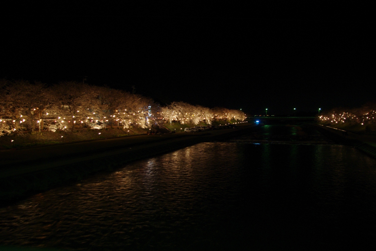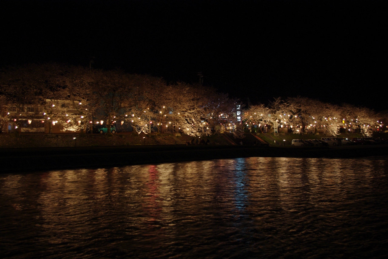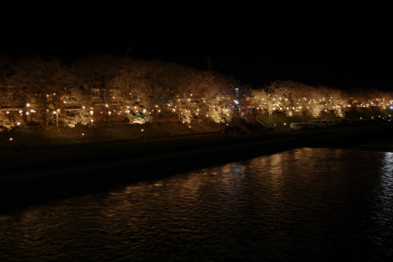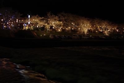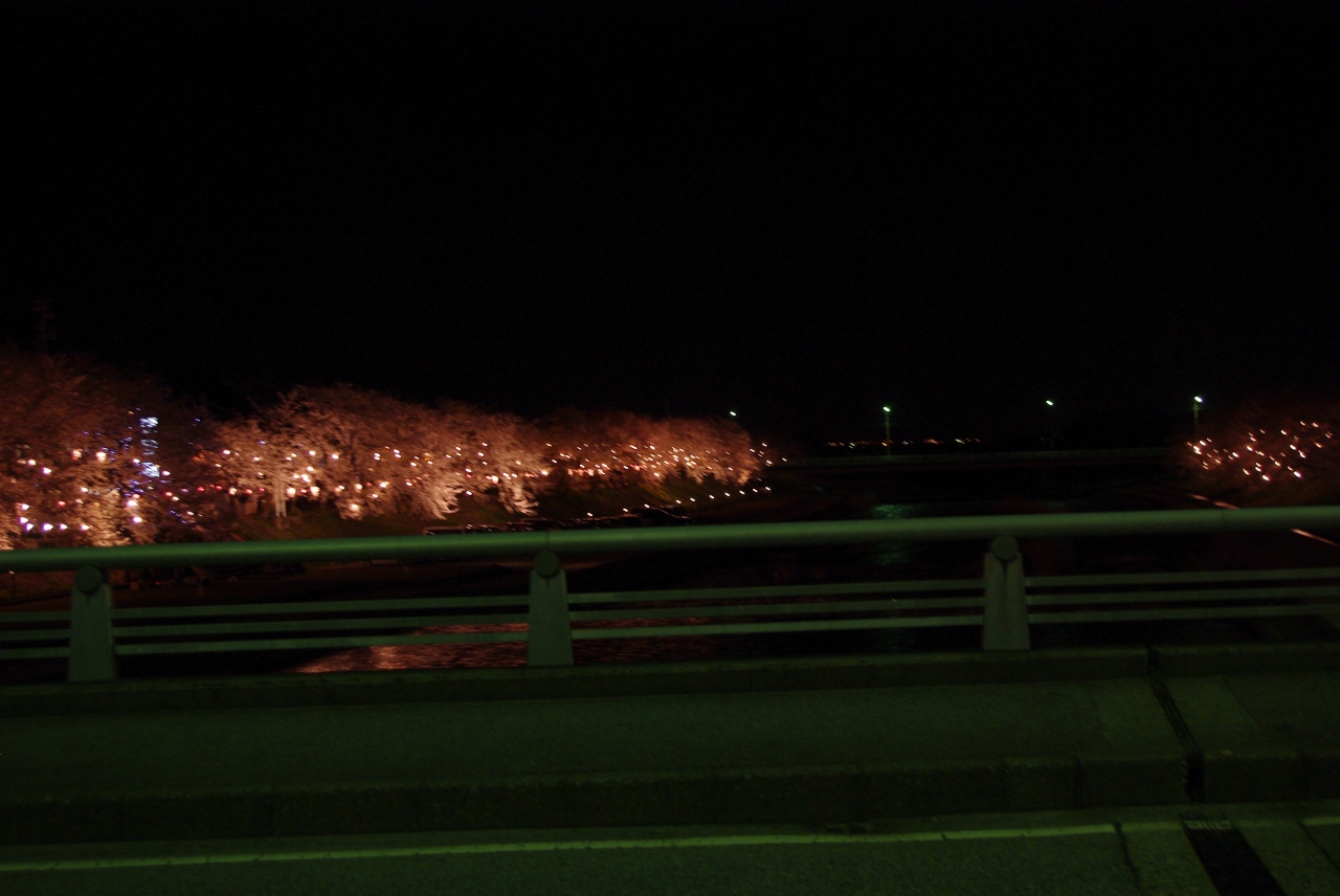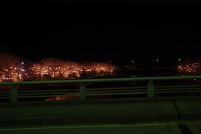 川沿いにず~んとライトアップされて浮かび上がった夜桜の帯は見事でした。