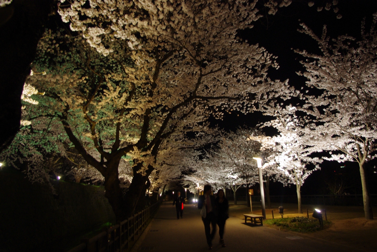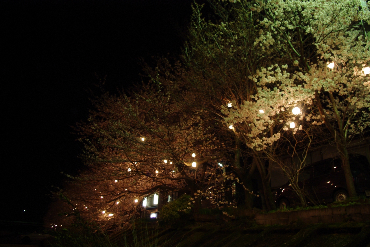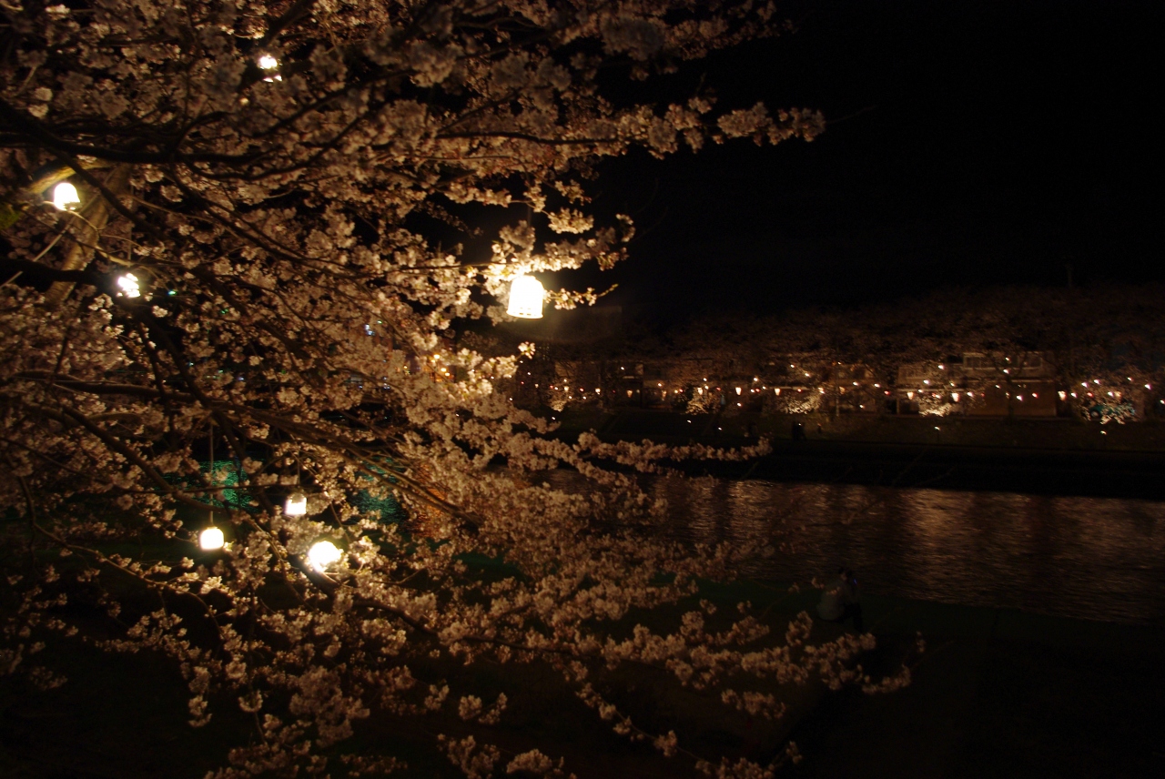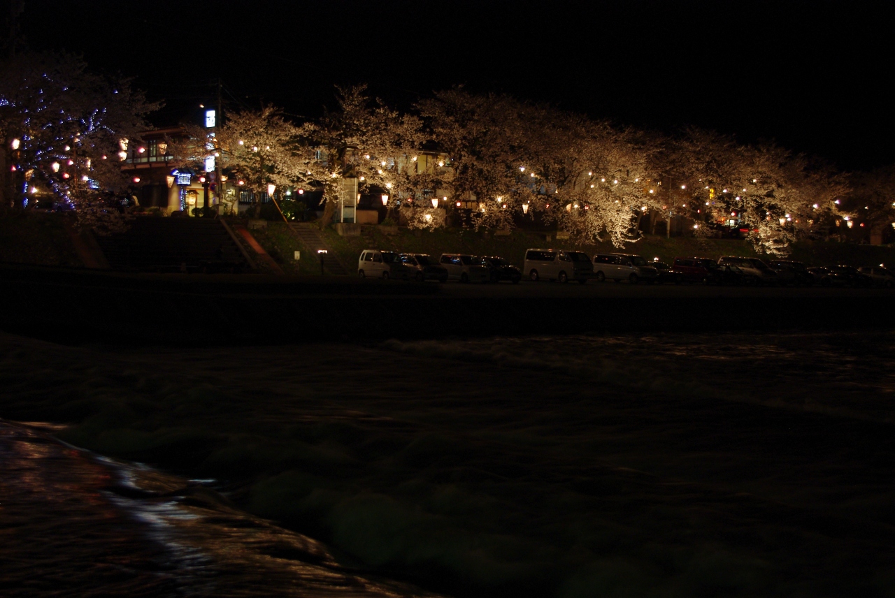 川沿いにず~んとライトアップされて浮かび上がった夜桜の帯は見事でした。