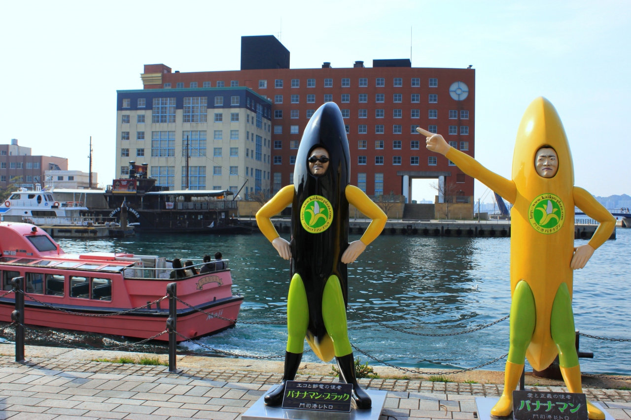 門司港レトロ地区を歩けば絶対に目にとまるバナナマンの像2体違和感ありすぎですけど...