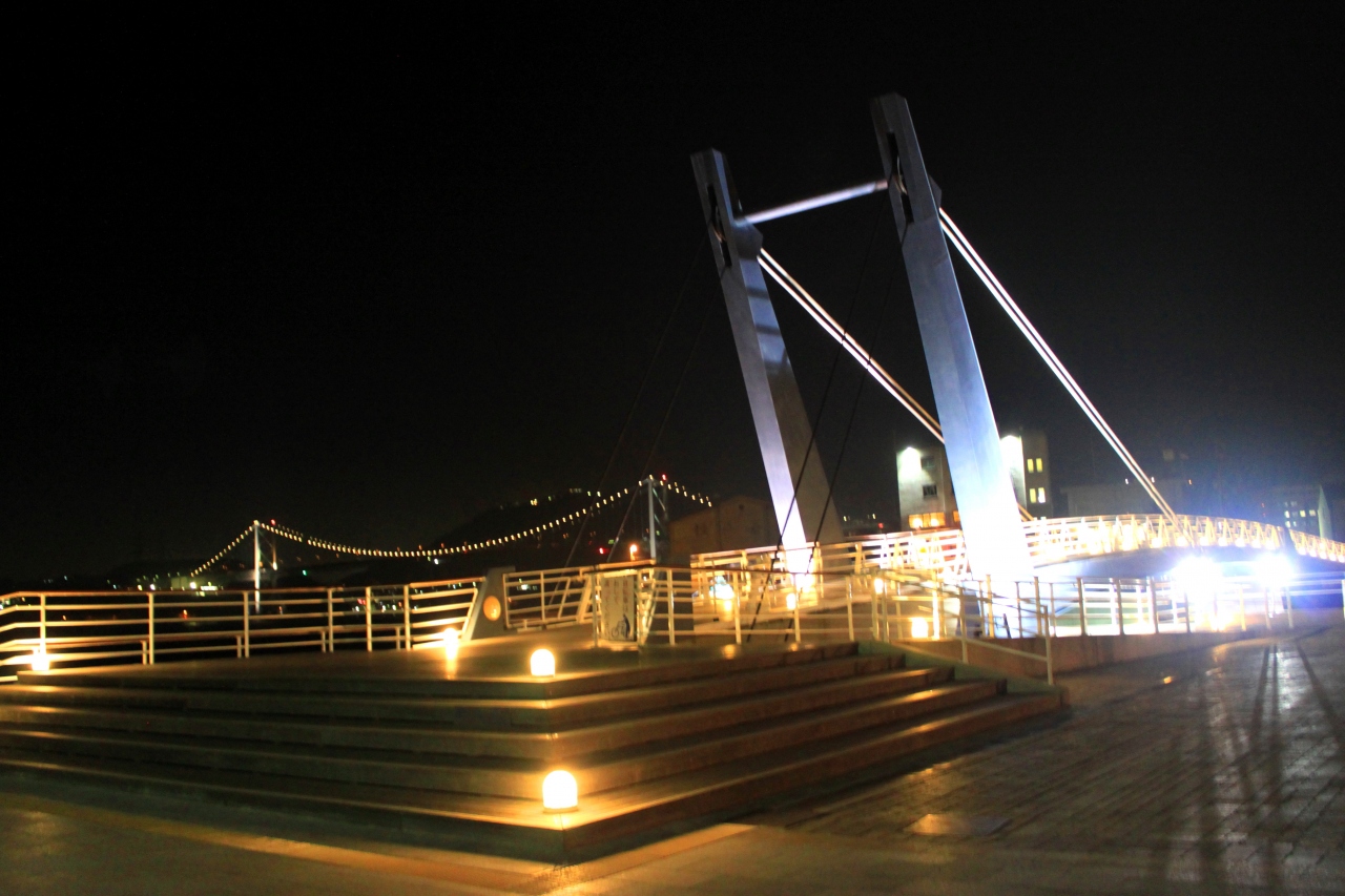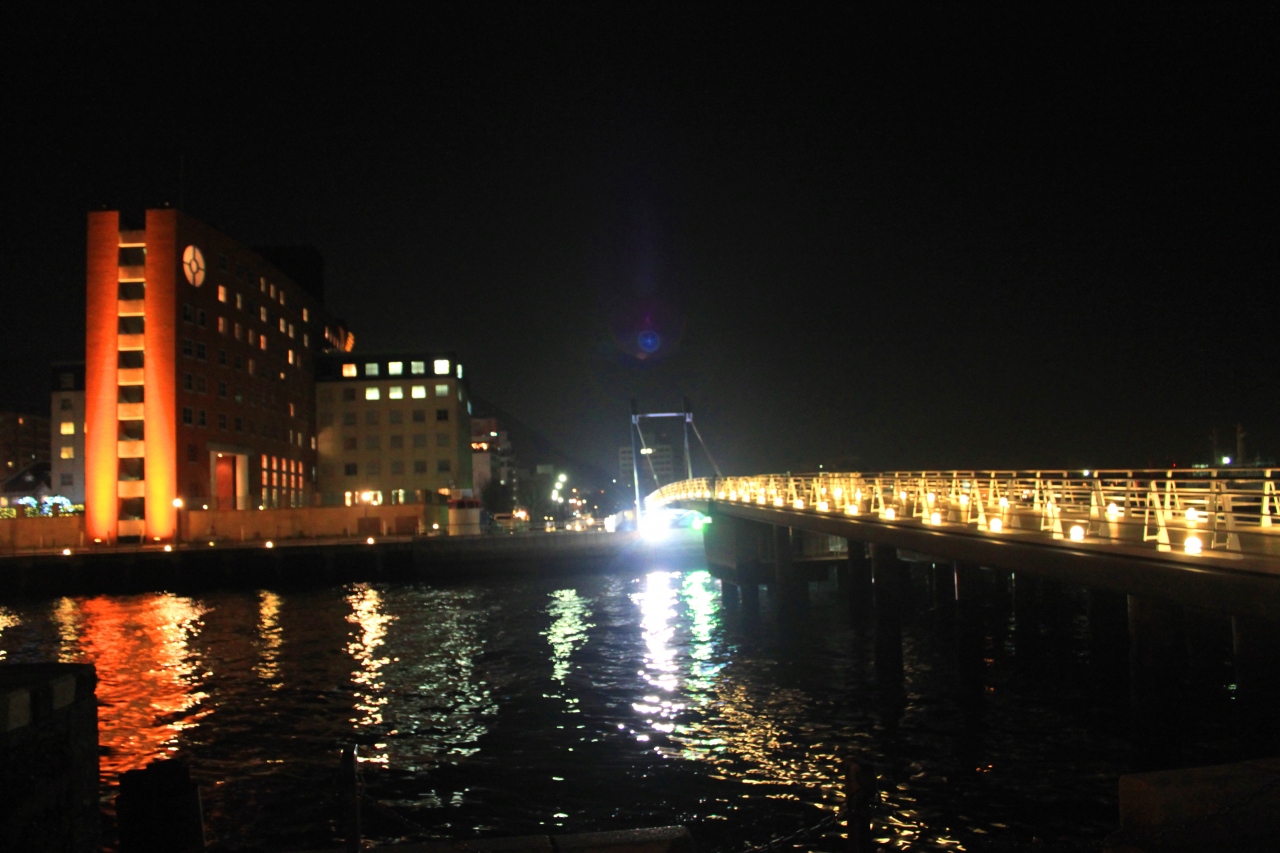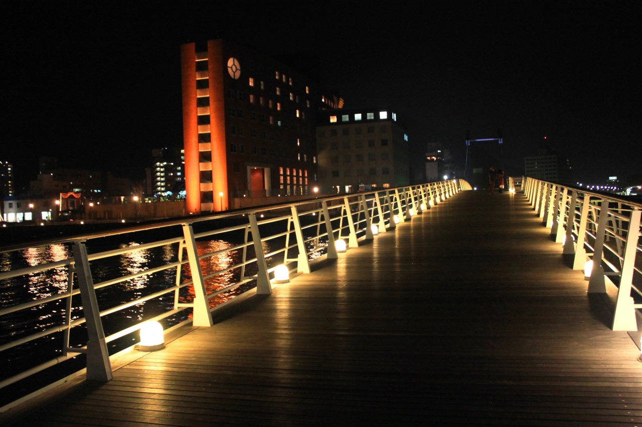 歩行者専用のはね橋は夜にはライトアップされていい雰囲気です♪