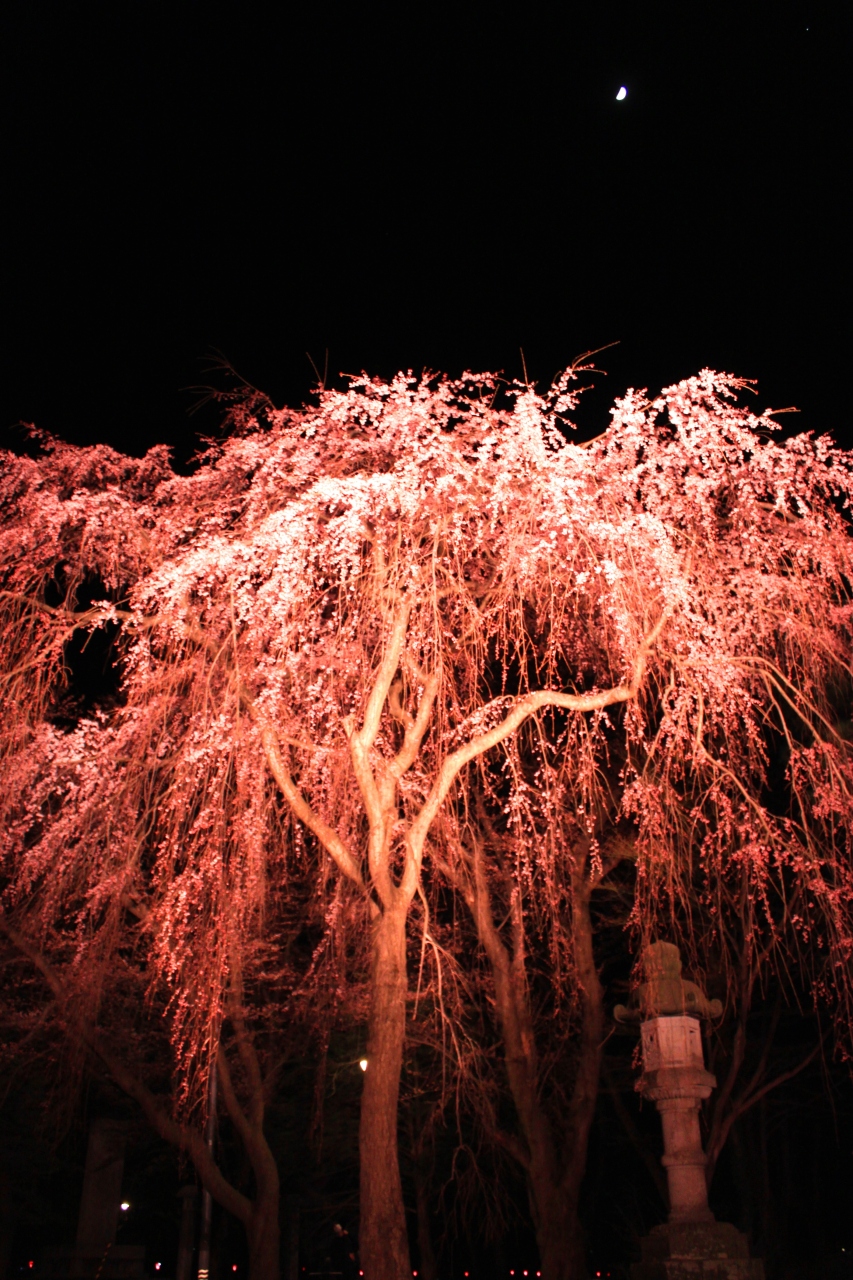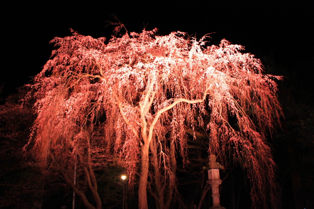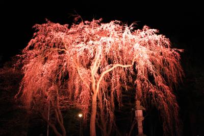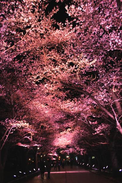 ぼんぼりの長い列とたくさんのライトに浮かび上がる桜は素敵です♪