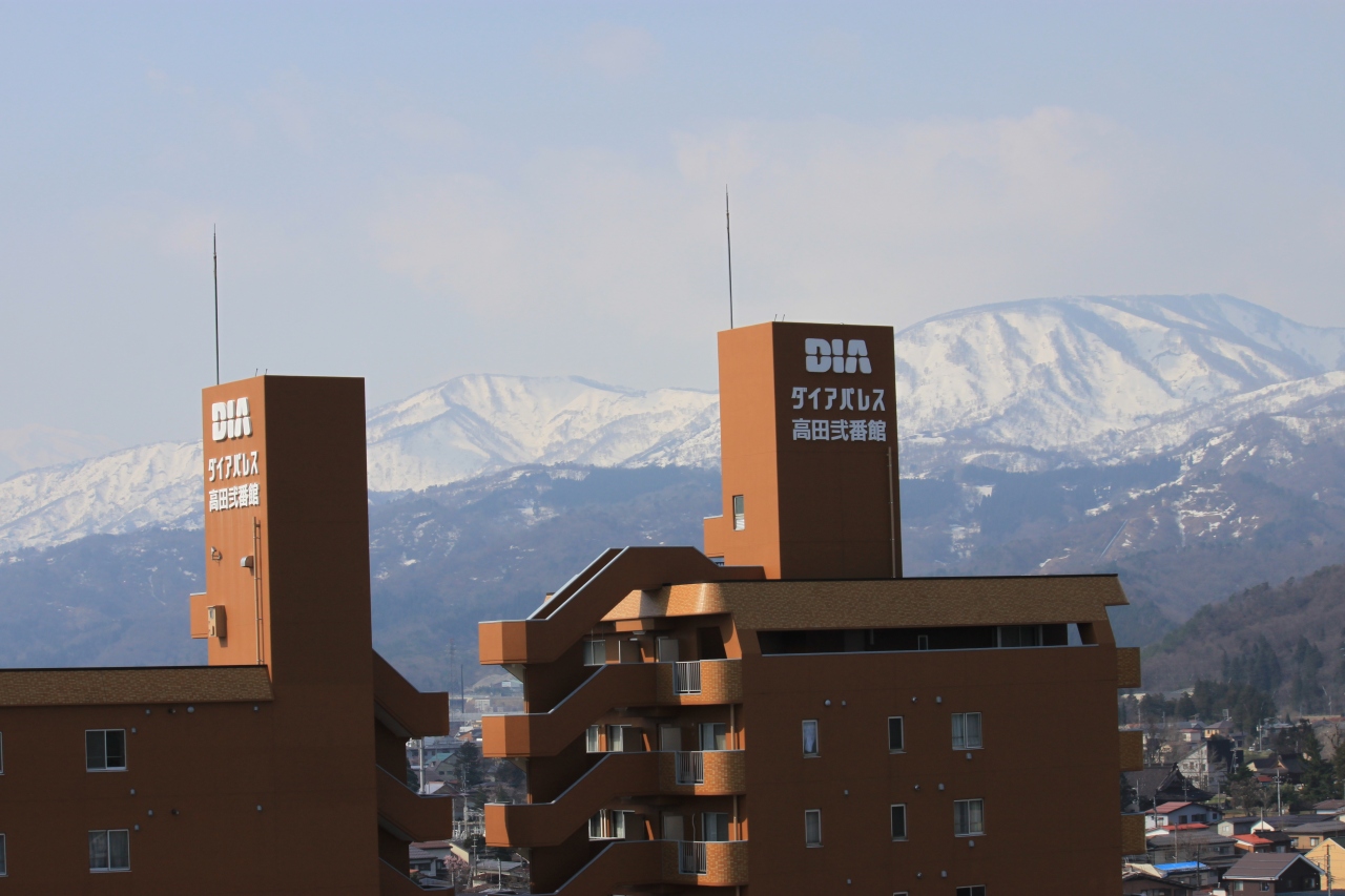 高田公園のお堀端から眺める残雪の山並みと桜並木は