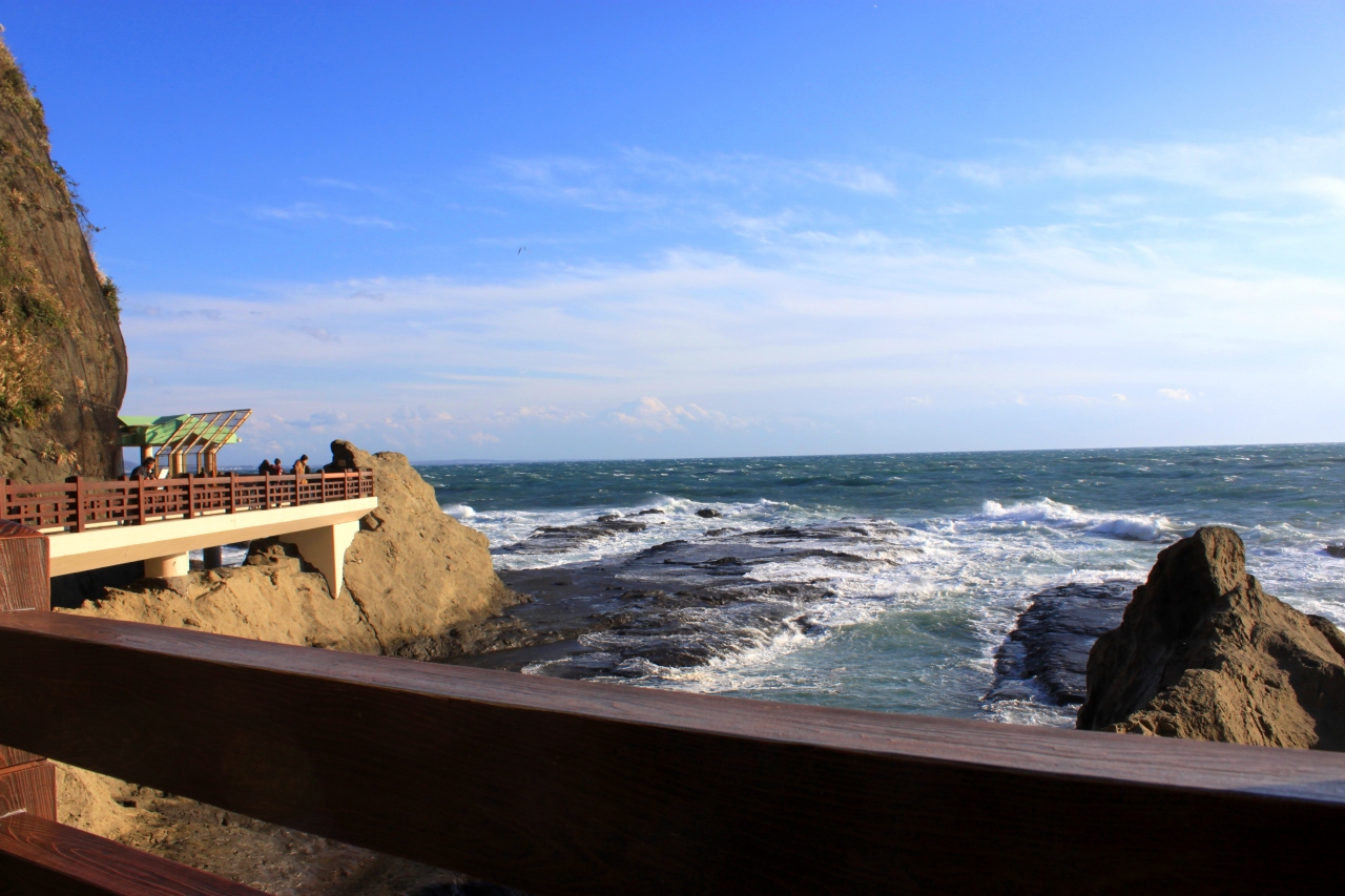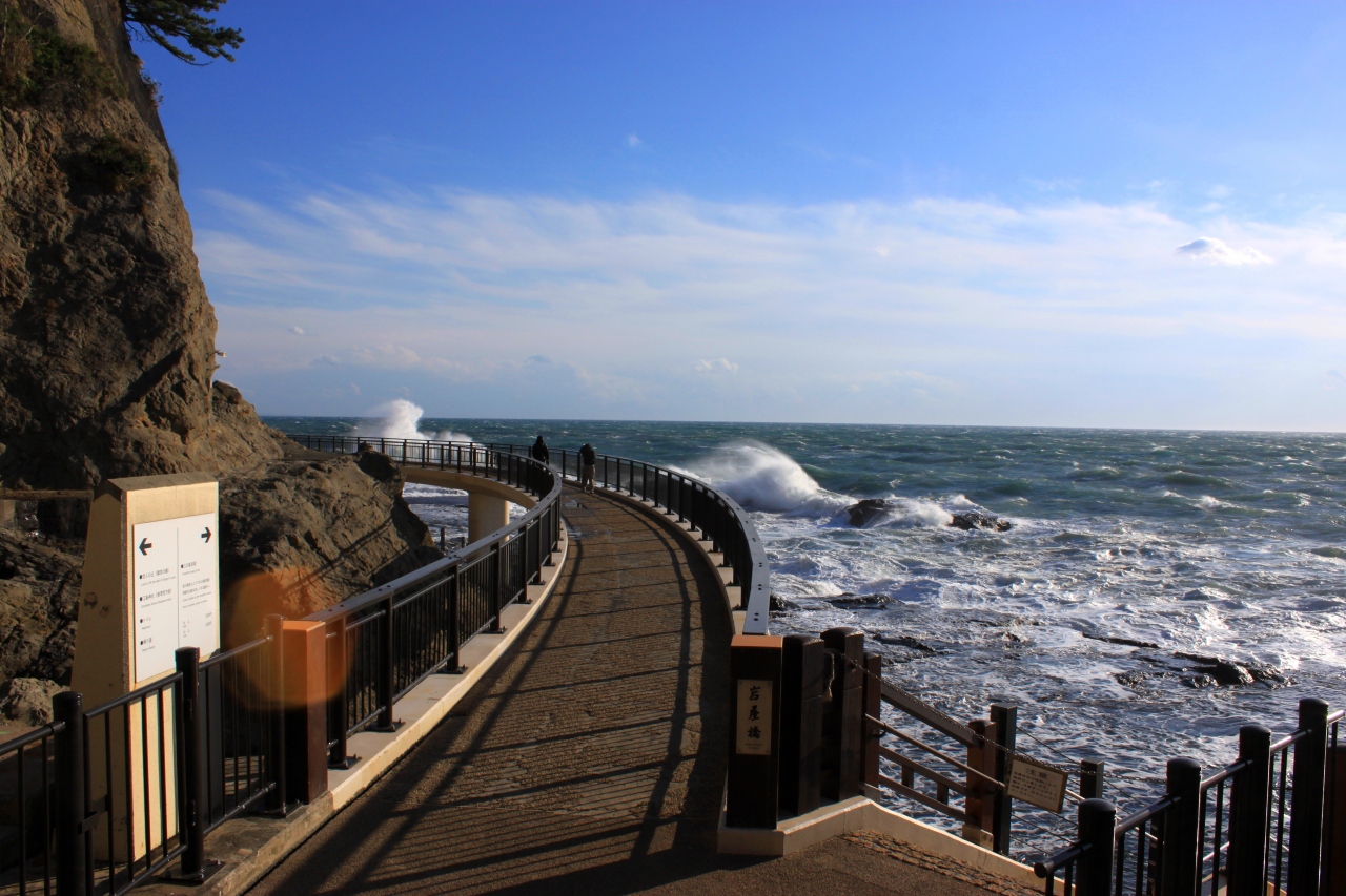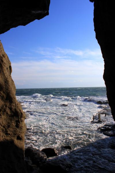 当日は強風で岩屋へ続く道は波しぶきを潜り抜けての道のりでした。