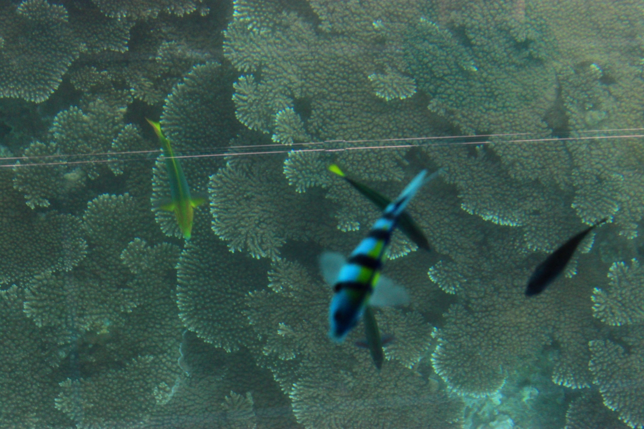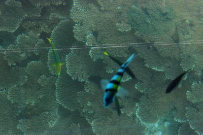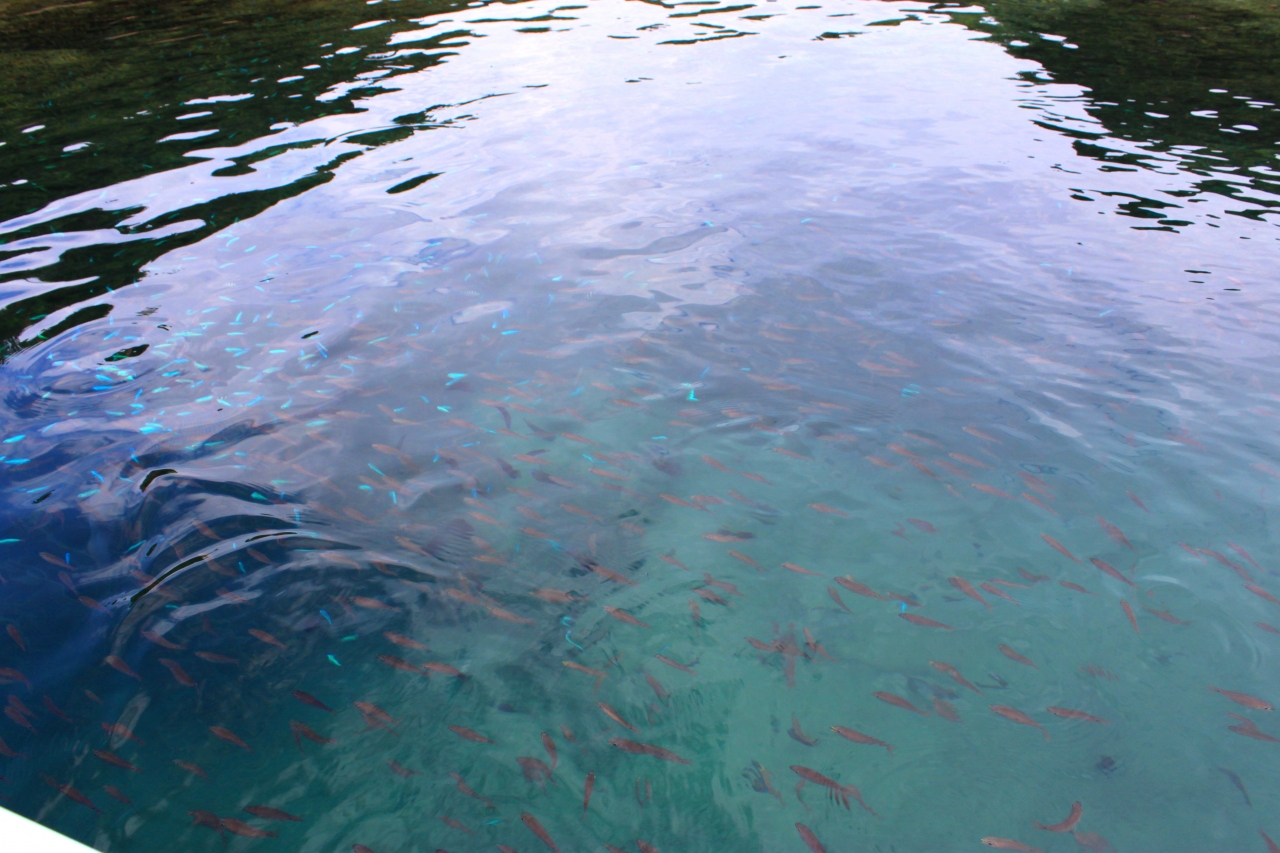 熱帯魚の多く見れるポイントで止まり、船長さんが餌をまくと大きな魚が海面に見えて