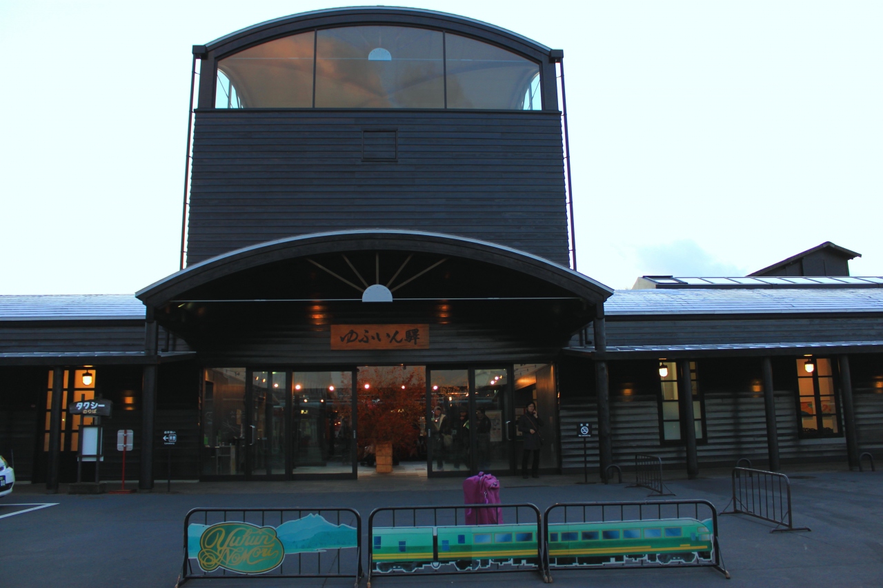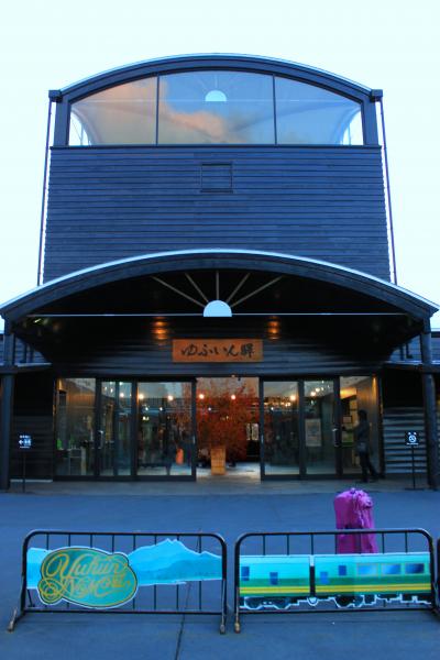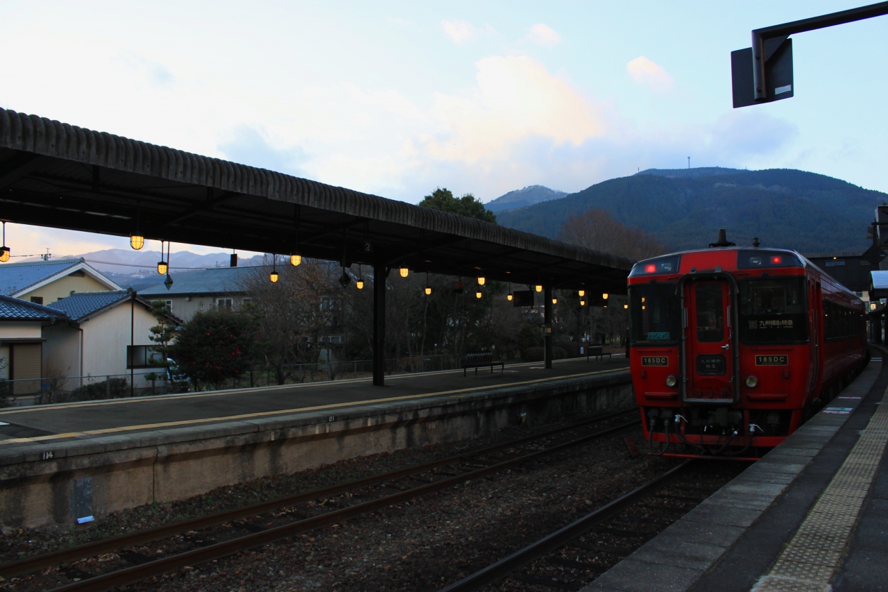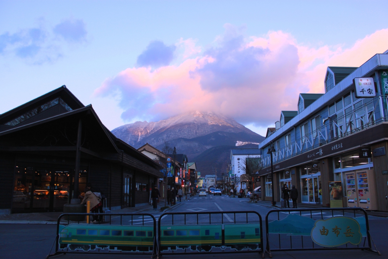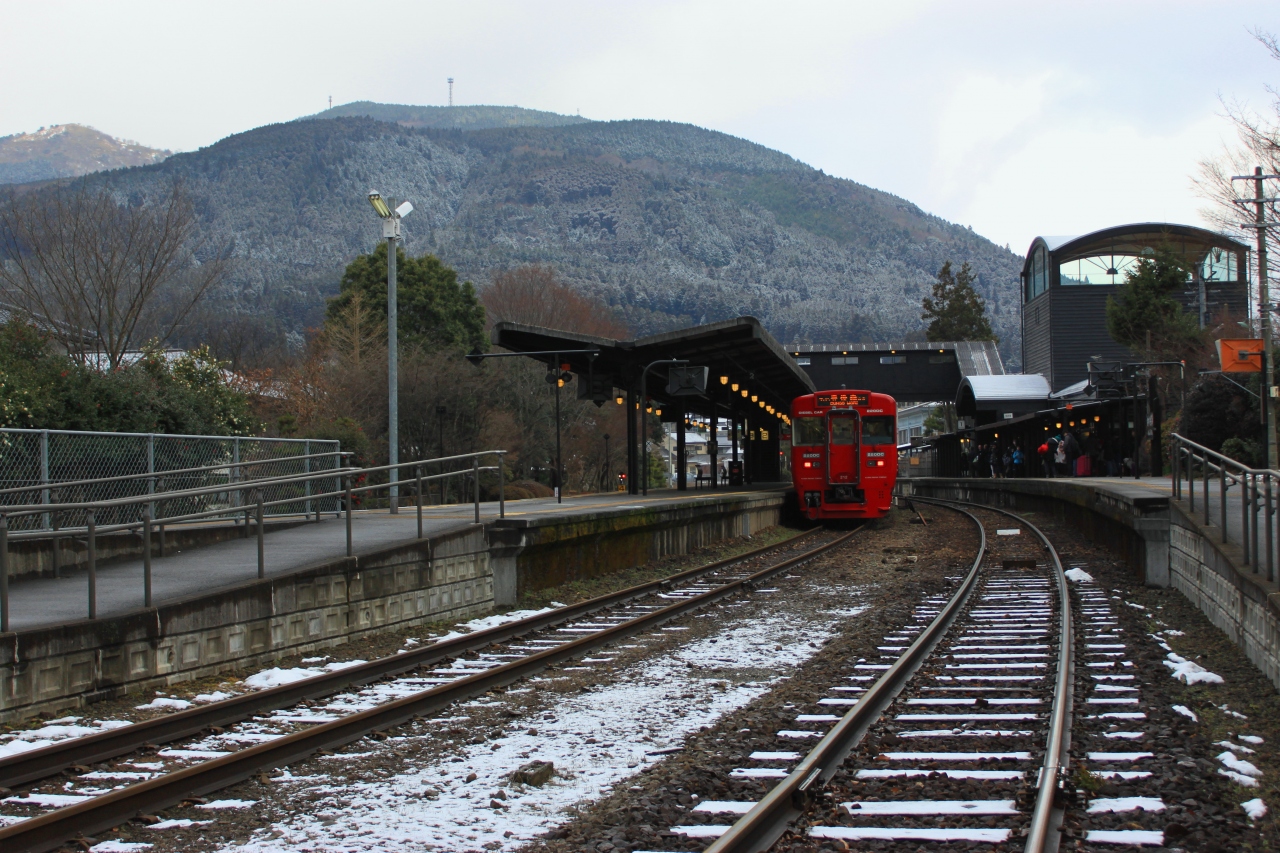 黒塗りのシックな駅舎を出て目に飛び込んできた雪化粧の由布岳に感動♪