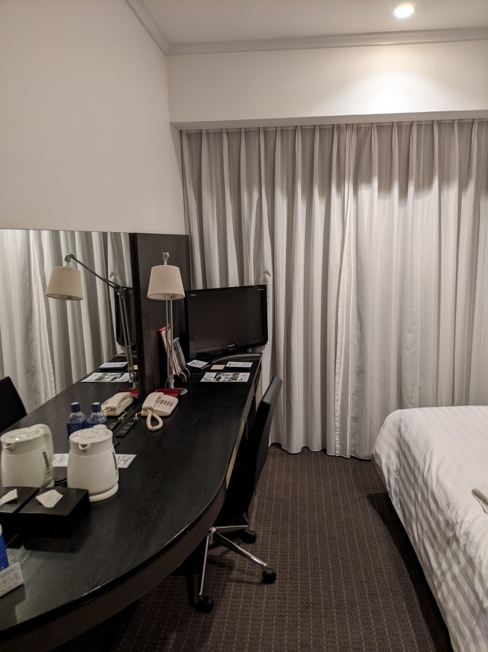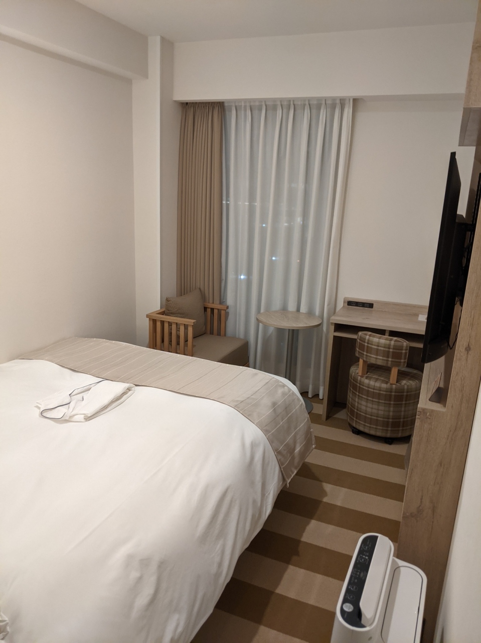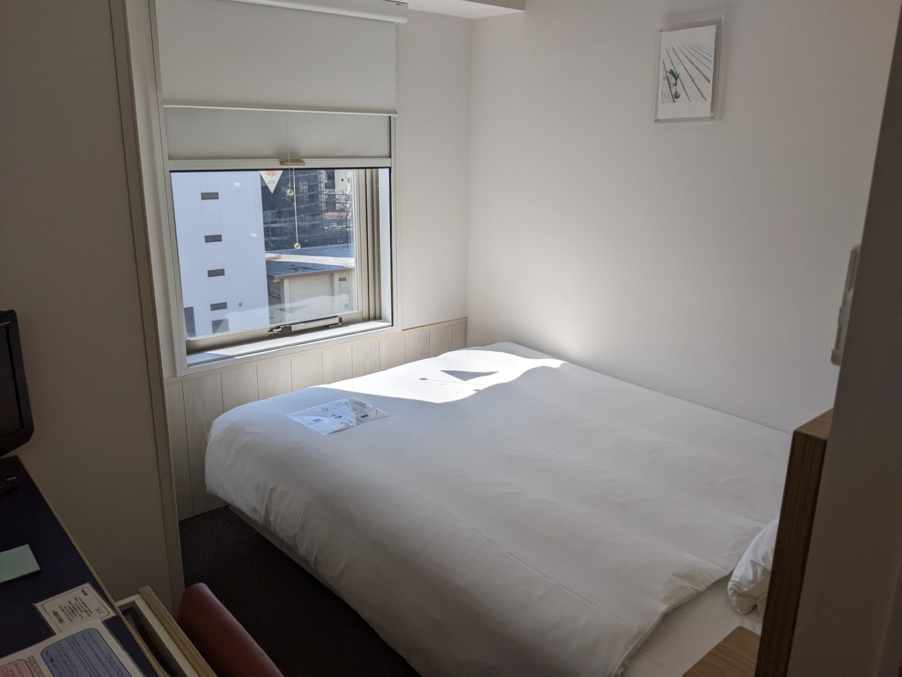 ベッドはセミダブルでしたが、部屋は11平米のコンパクトサイズ。スマホ充電器は部屋にはなく、フロントで無料貸出しをしています。