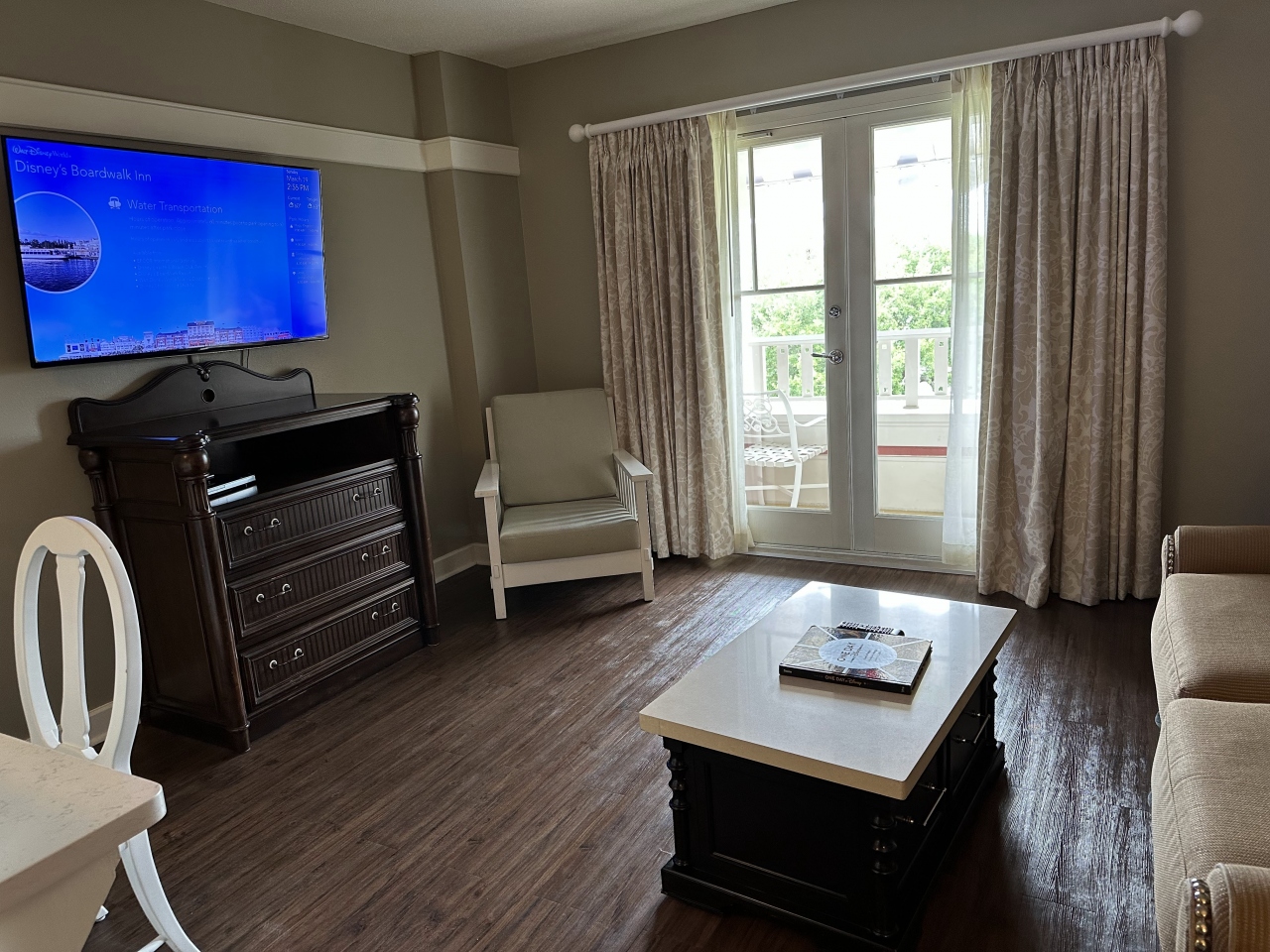 テーブル&イスセットの他に大型テレビとチェスト、冷蔵庫、コーヒーメーカー