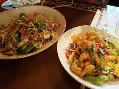 ロメインヌードルのチキン(焼きそばっぽい)とファイヤークラッカーシュリンプ(エビマヨサラダ)をオーダー。エビはかなりスパイシーでしたが、味付けは日本人好みでとても食べやすかったです。