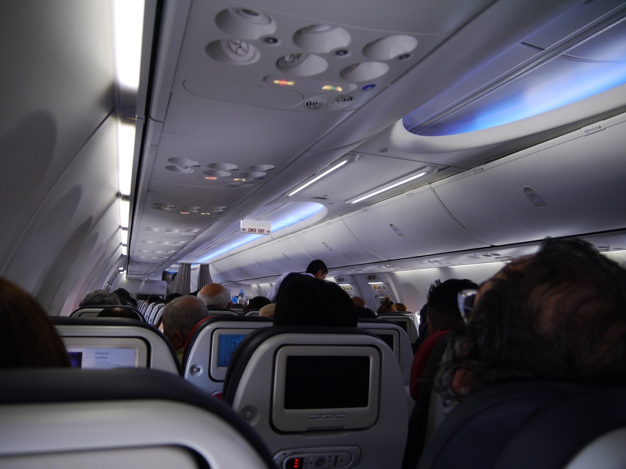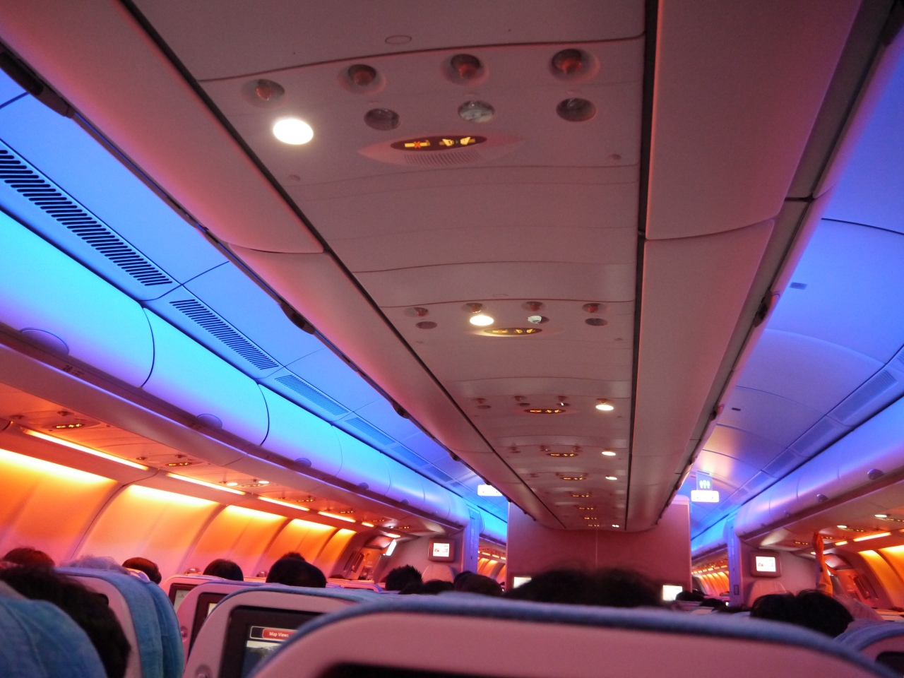 機材はA330で成田発のB777と比べると見劣りがするかも。機体自体が小さく、満席だと12時間のフライトでは少し圧迫感がある。