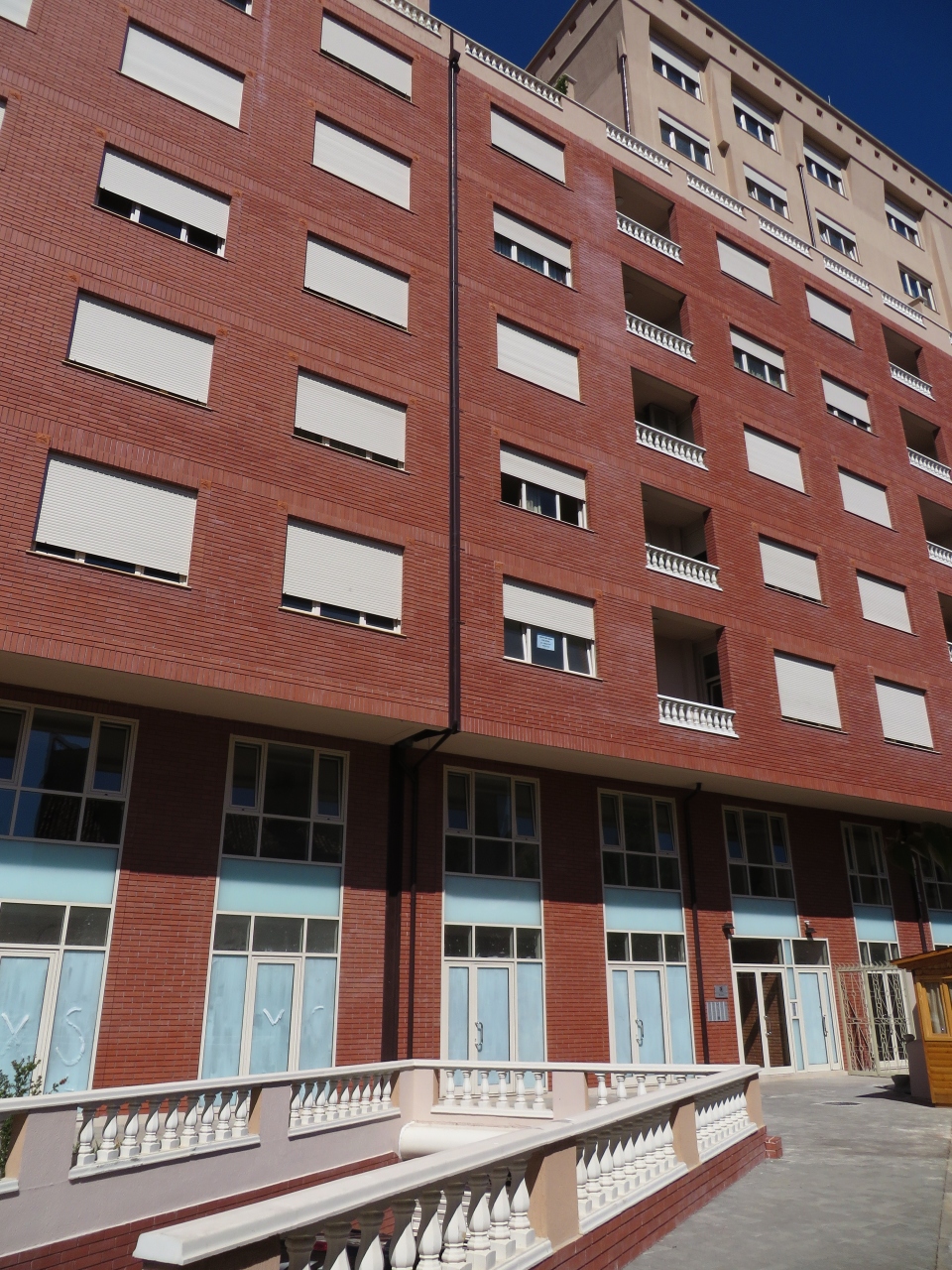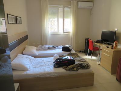 レセプションがビルの2Fにあり、少しわかりにくいですが、きょろきょろしていると、オーナーが出てきてこっちだと案内してくれました。茶色の建物です。部屋は別棟になり、レセプションの裏手のビルです。2重に扉があり、セキュリティはしっかりしています。もっとも、ティラナはとても安全な街ですが。