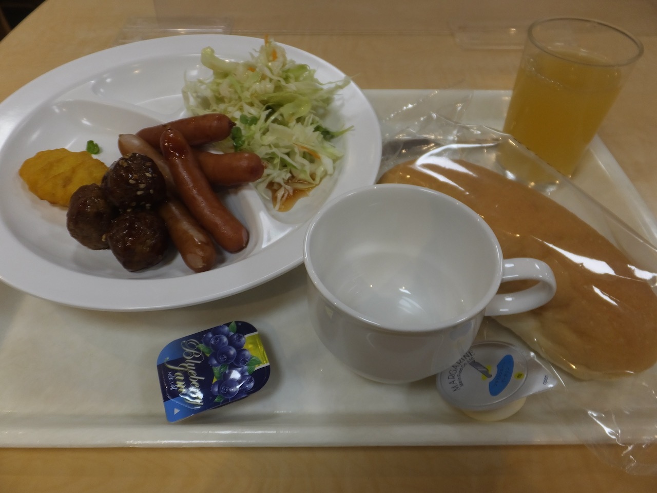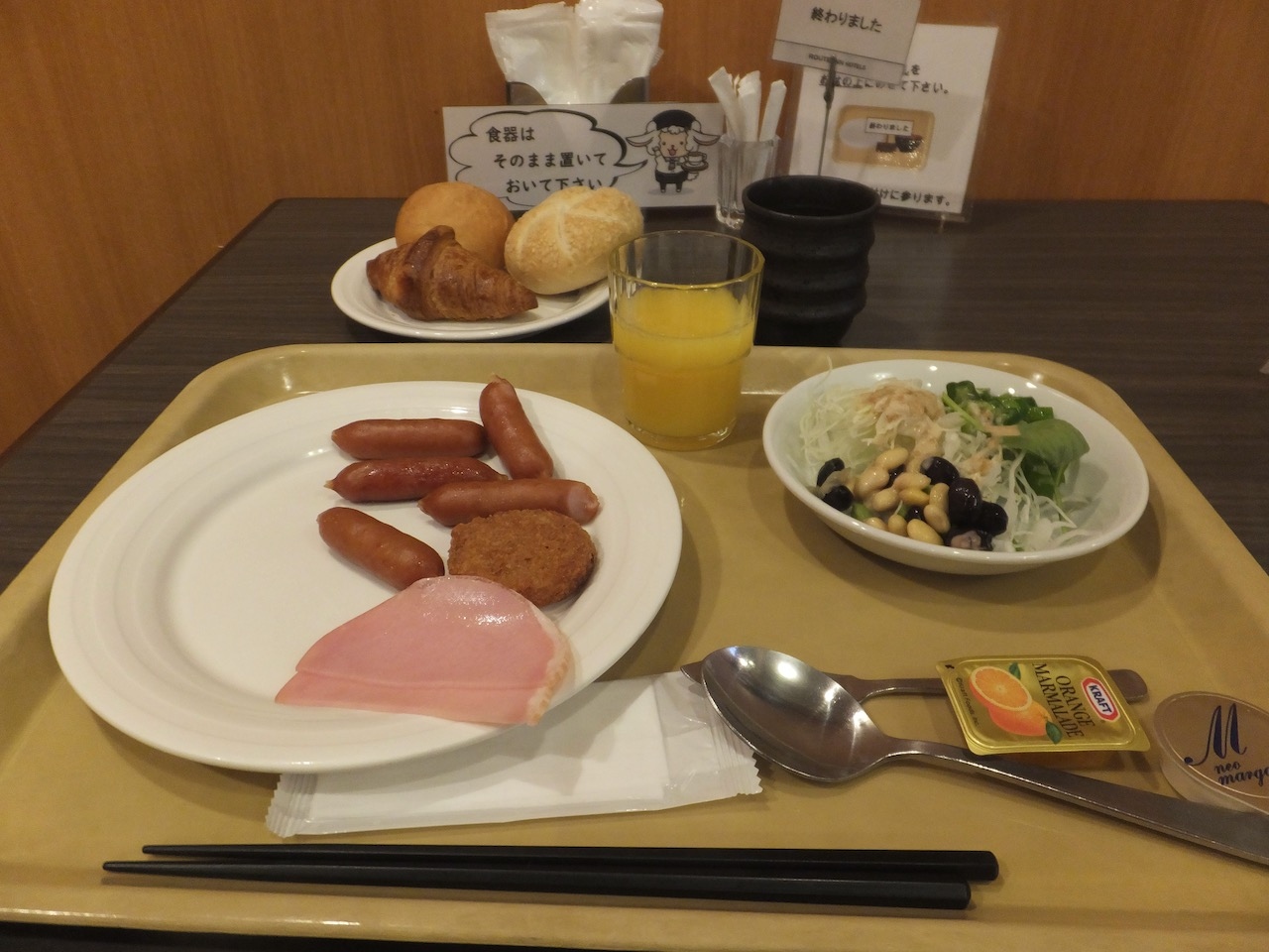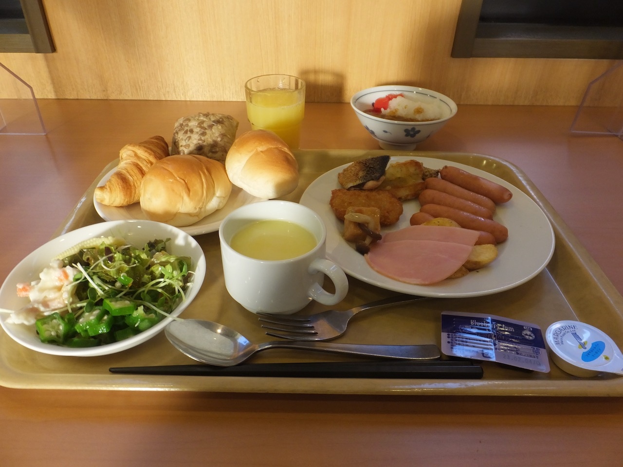 朝食は無料。肉も多く、サラダも野菜種類多いですし、朝カレーもあります。パンもハード系主体のようですが、ソフトなロールパンもありました。