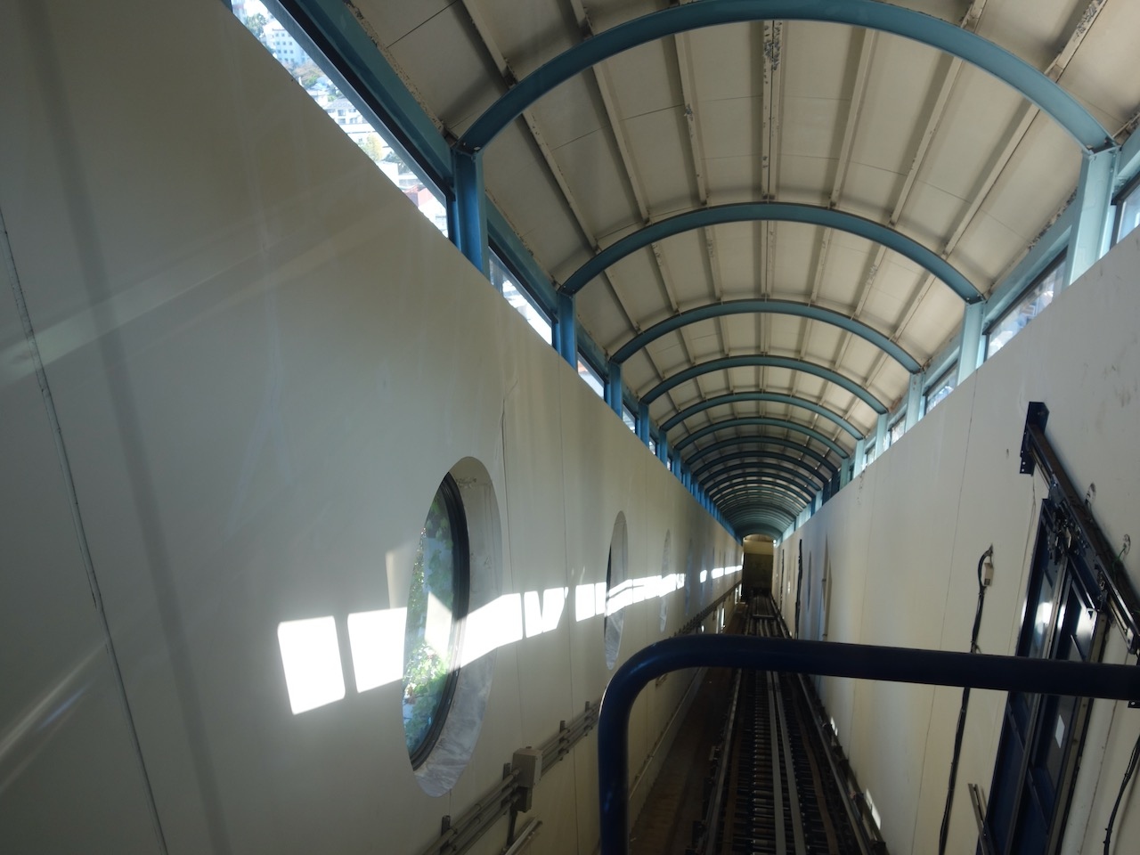 斜行エレベータの周囲は住宅地なのでところどころにある丸穴からちらりと外界が見えるだけで、基本シェルターの中。眺望はありません。