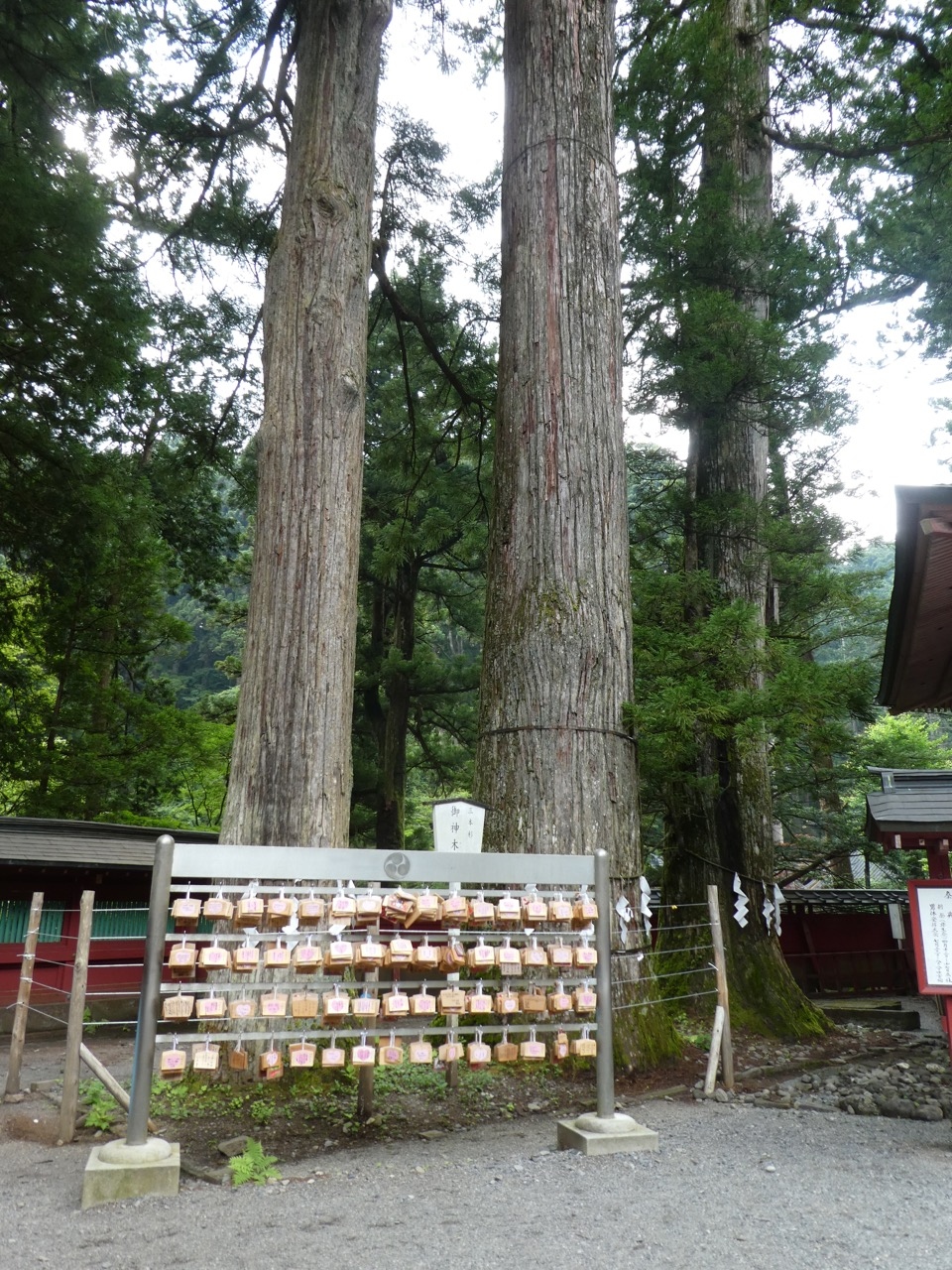 まあ、二荒山神社の御神木並の巨木。これが崖から道路に張り出すように生えています。道路の狭さ、とくに反対側が神橋で川だということから道路拡張しようとしたら、この杉を除去するしかないわけで、たしかに悩ましいことだったでしょう。おかげで現在この部分に歩道がなく、表参道へは車道の隅を歩くか、階段で上方迂回せねばならない、という不便さはあります。