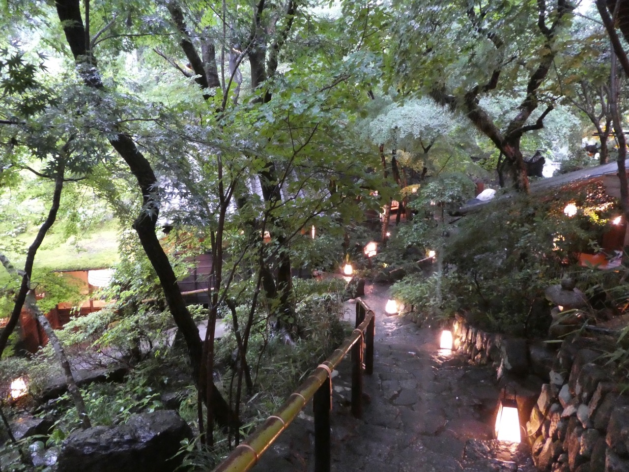 武蔵五日市の市街のちょっと外れ。こんなとこに、という普通の郊外の風景から一歩敷地に入ると、秋川の斜面を利用した緑深い林の中に古民家の大きな棟がいくつか。小さな村のよう。受付へは階段を上る感じ。個室に案内されると、もうそこは森の中の別荘のお部屋。