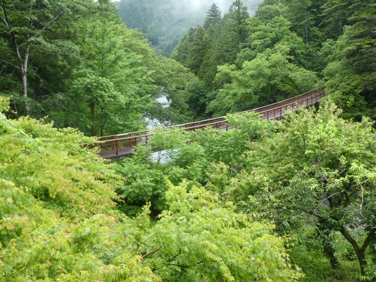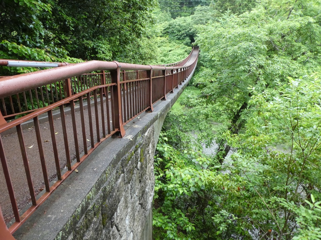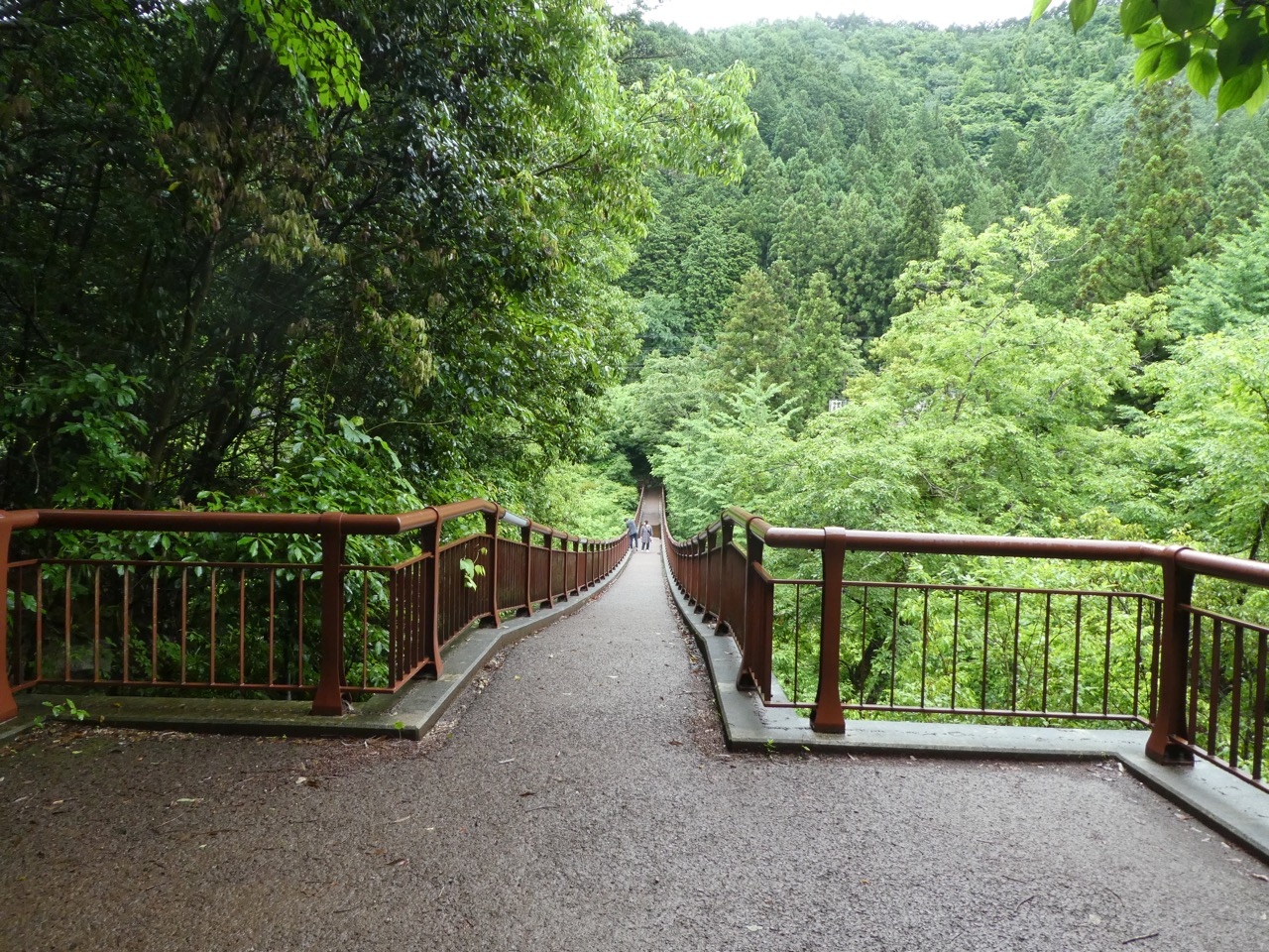 珍しい支柱のない吊り橋です。昔、広島の山奥でこの構造の日本一の大きさの吊り橋を見て以來です。他にはほとんどないのではないでしょうか。