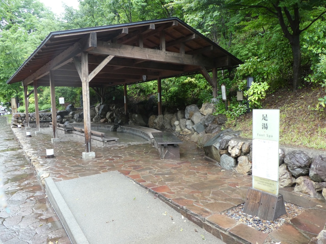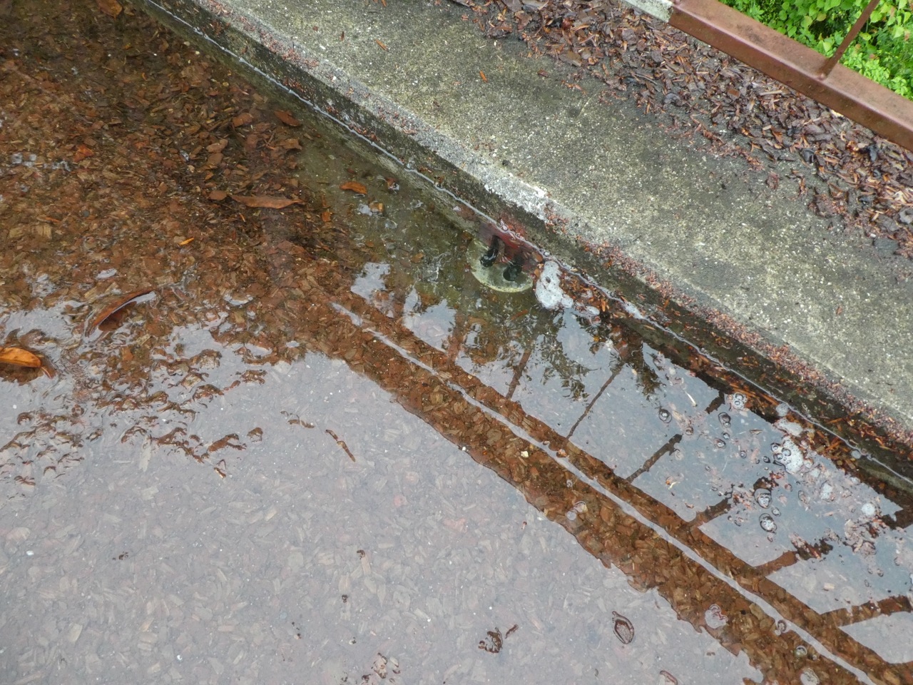 両はしに数メートルおきに排水口があるのですが土と落ち葉で埋まって排水不能な状態になってました。傘の先でつついて開通させました。