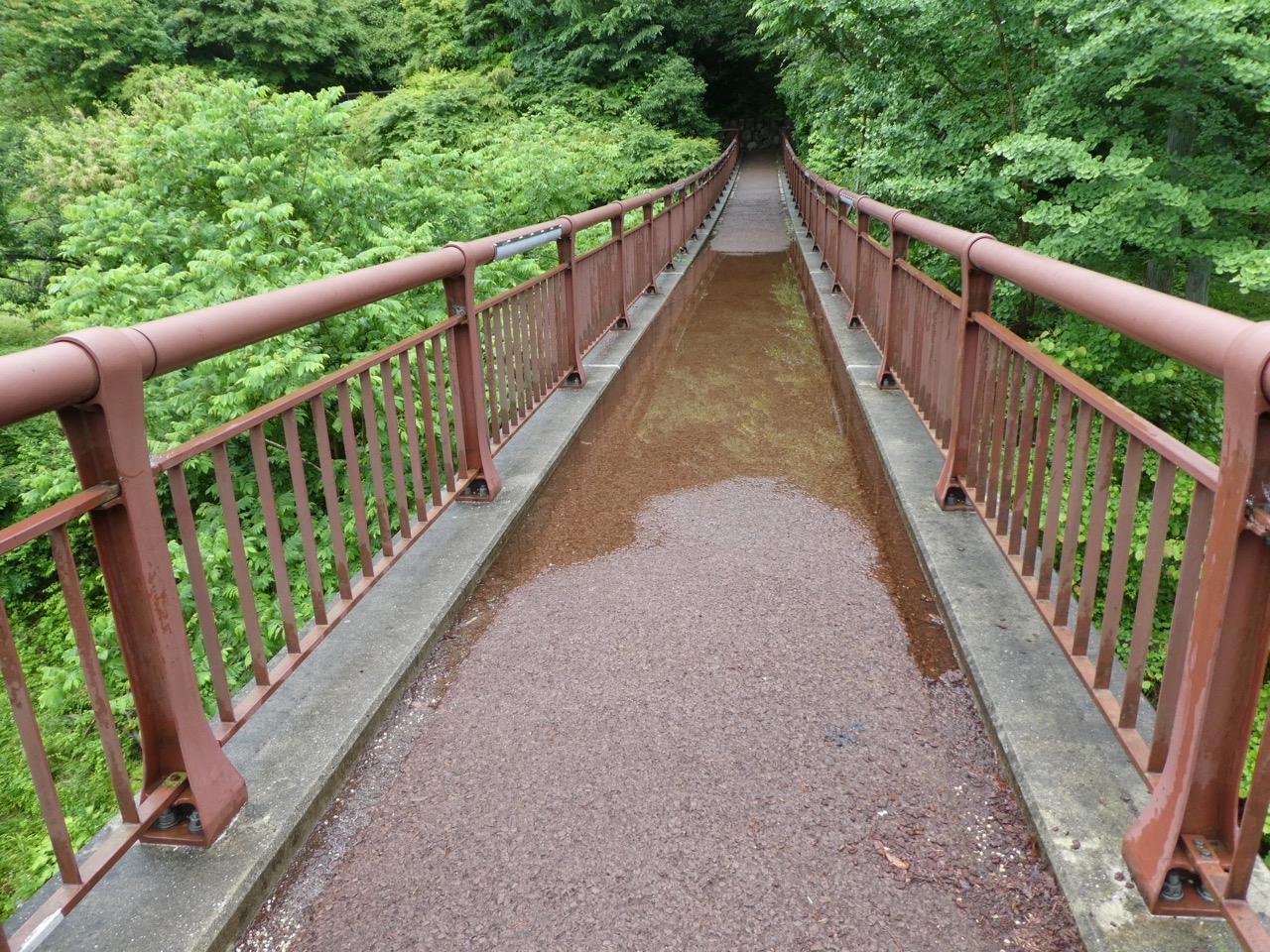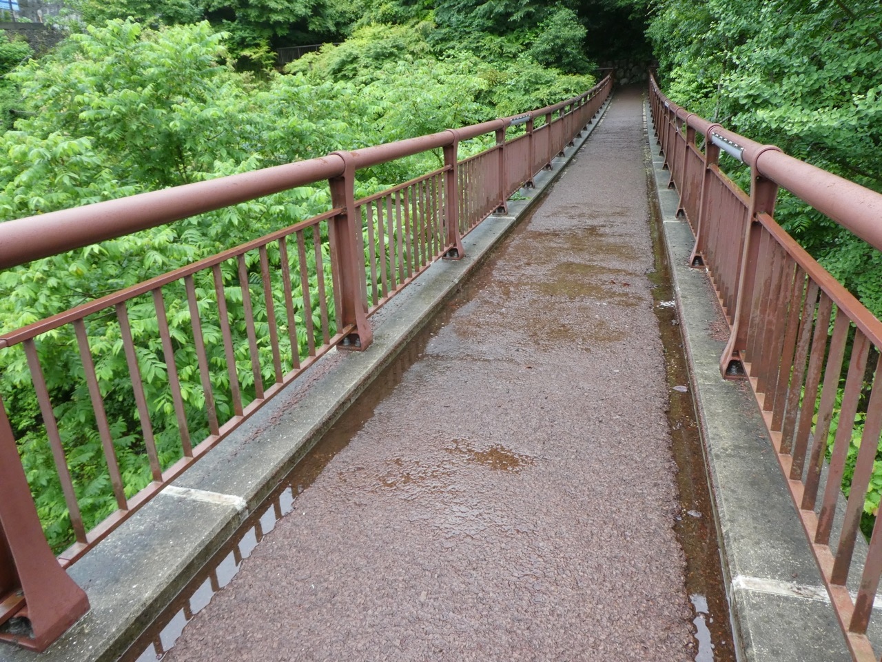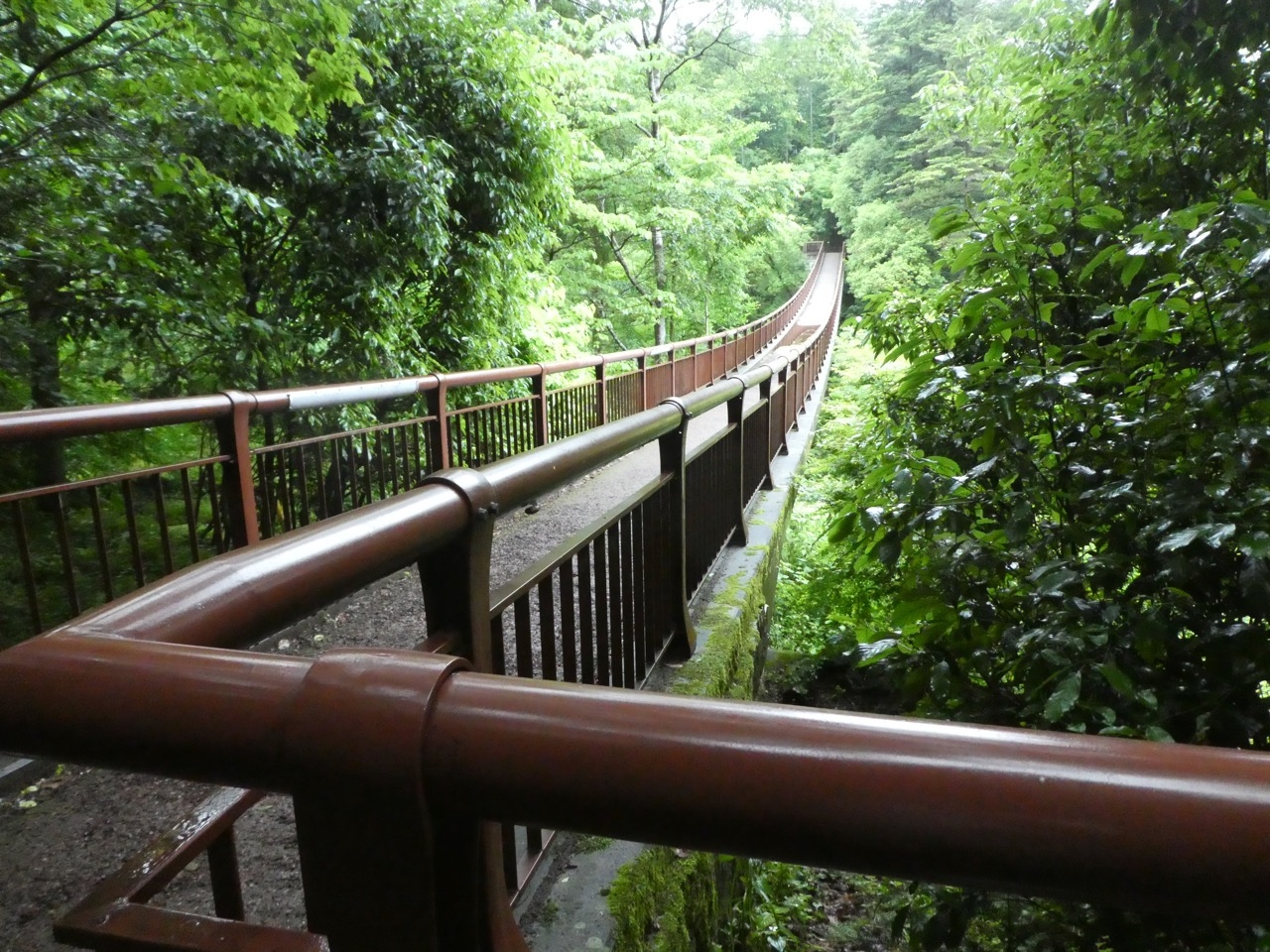 路面はしっかりウレタンかなにかで固められているので普通の散歩道のように歩けます。下が見えるような橋ではないので怖いということはないでしょう。