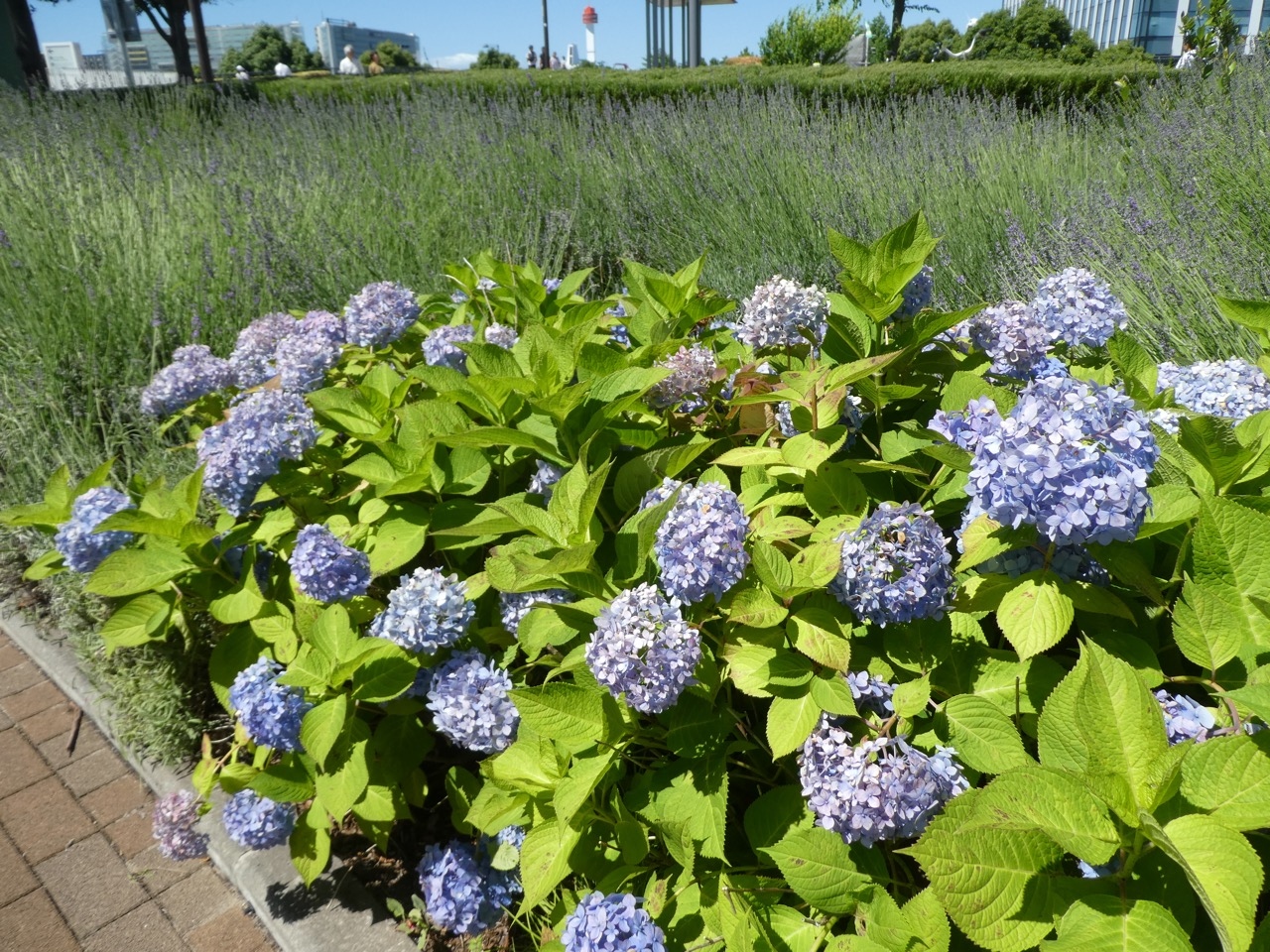 梅雨時の晴れ間の訪問です。東京テレポート駅から少し登ったプロムナードの肩の部分はお花でいっぱい。真っ白の紫陽花がとくにきれい。結婚式の白いドレスが似合いそう。その上の舗道もラベンダーがいっぱい。いい香り。まとまった量でこんもりした感じなので、数の迫力があります。都会の公園としては異色のすばらしさでした。