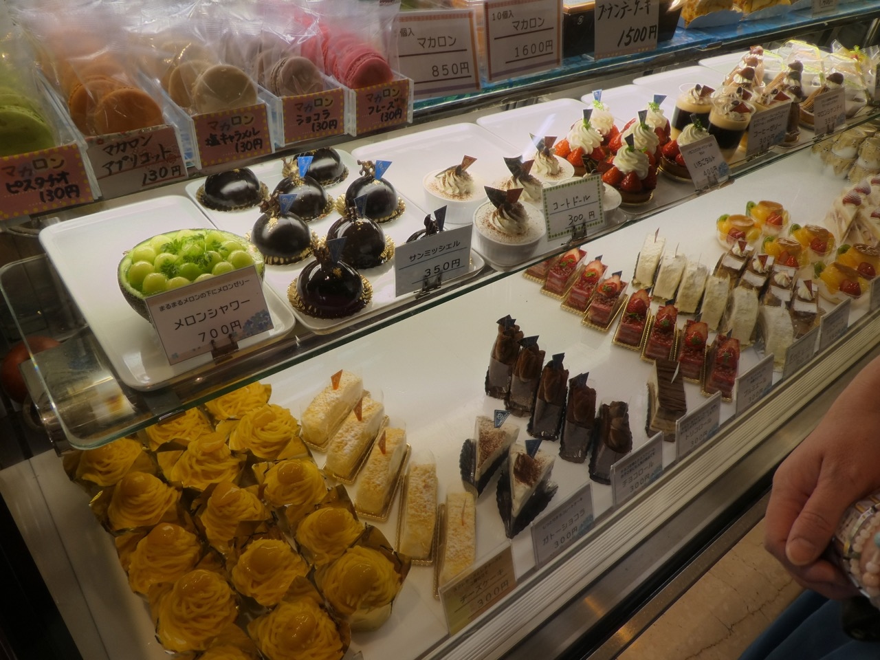 さて、今回はホテルで夕食後に食べる生ケーキの購入です。種類が多く迷ってしまいます。目をひいたのがメロンをくりぬいてそこにゼリーを詰め込んだ「メロンシャワー」。今回はホテルが遠方だったので保冷バッグに入る大きさではなく断念。マロンシャンティ(渋皮モンブラン)350円、トリコロール300円、コーヒーゼリー300円の3種購入。これまた安価なのに美味しいです。- 旅行時期