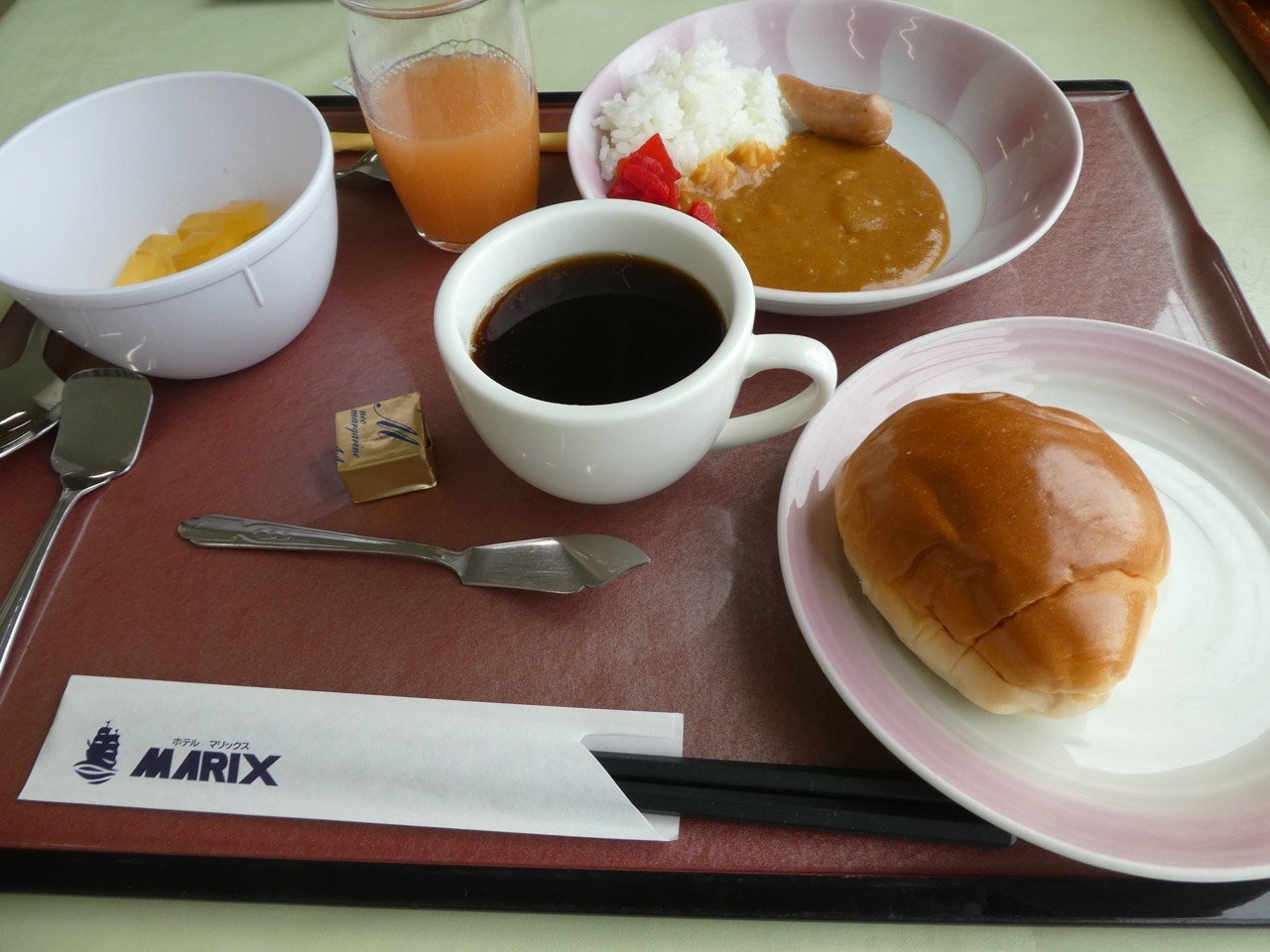 朝食はバイキング。普通のロールパンがあり、マーガリンも紙に個包装で、ビジネスホテルにしては手抜き感がなく、おいしい朝食です。