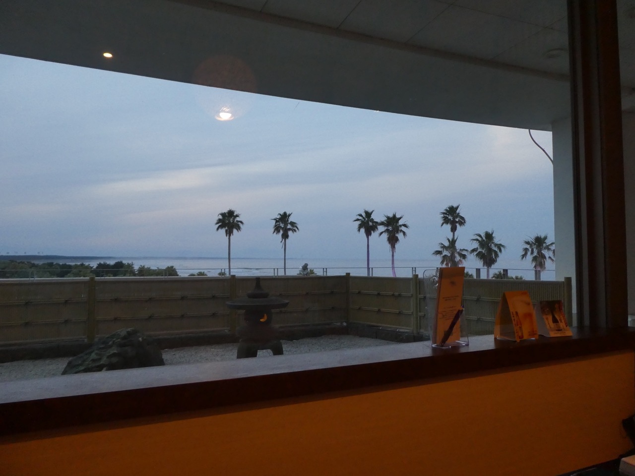 個室です。でも窓が広く、明るいです。そして坪庭の向こうにワシントニアパームが揺れ、その向こうは海という南国風の眺め。純和風でなくリゾート感があるのがいいです。さらに海の向こうにはシェラトンの高層ホテルがかすかに見えます。