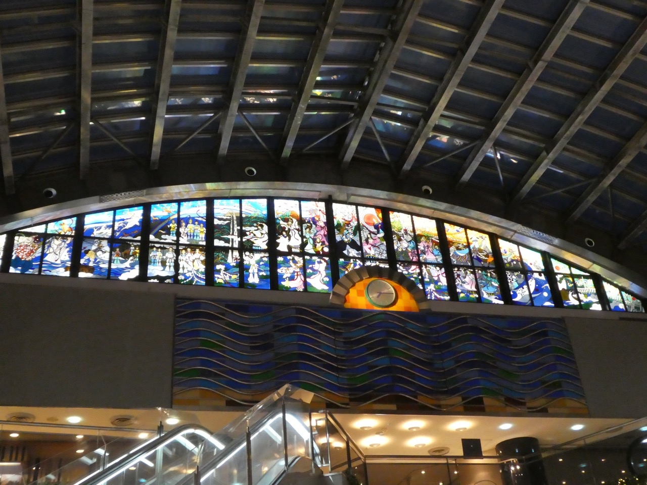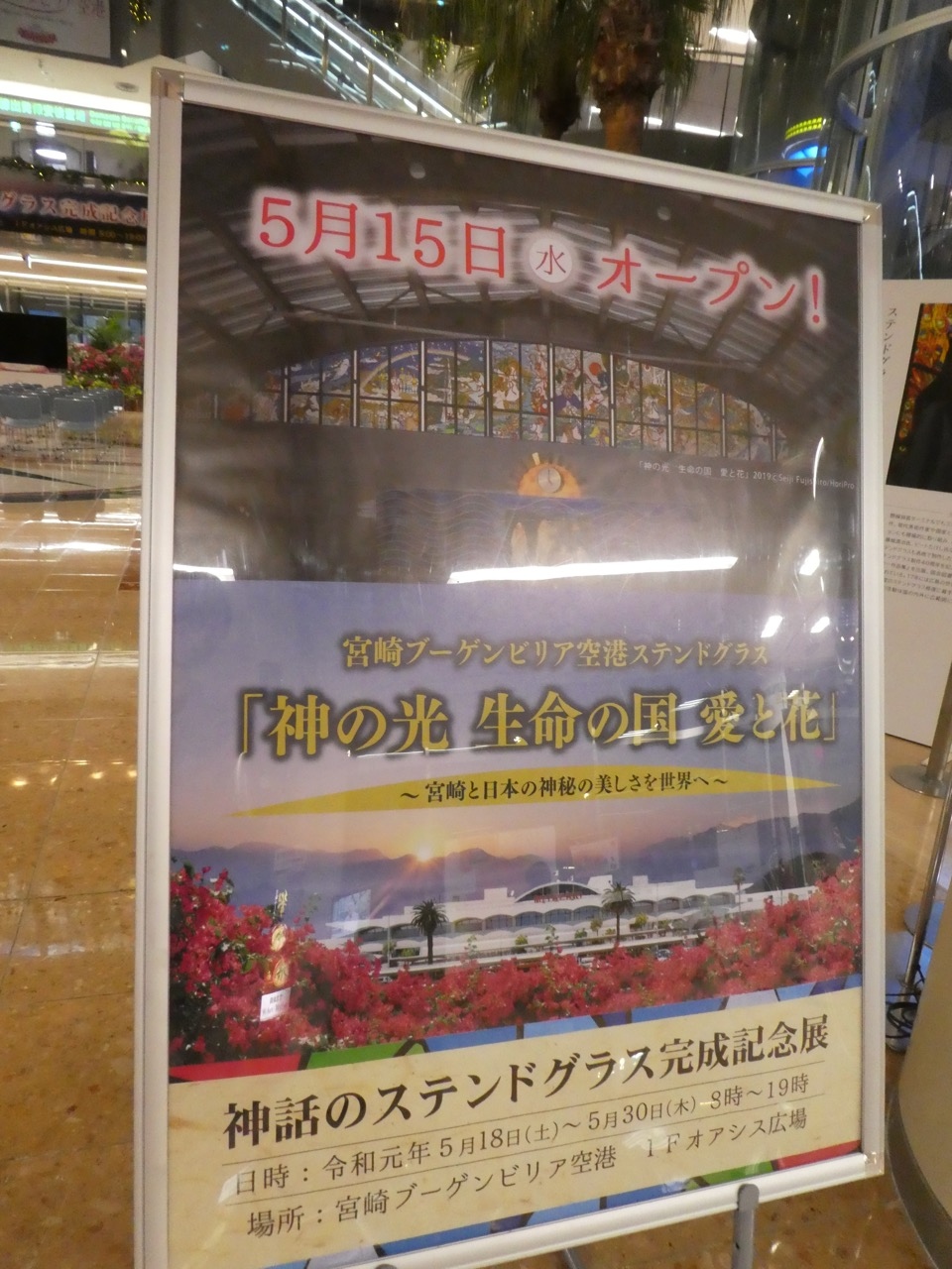 2019年5月15日。宮崎空港にステンドグラスができました。中の吹き抜けの正面。屋根がガラスドームになっている妻部分、てっぺんの三日月型の部分です。ちょっと高さ方向が狭いですが、宮崎は天孫降臨の神話の国であることから、影絵作家の藤城さんという方のデザインで、神話のストーリーがはめ込まれてます。3階の駐車場側正面、エアポートギャラリーに「ステンドグラス見学タッチパネル」があって、どこの部分がどんな神話なのかを見ることができます。
