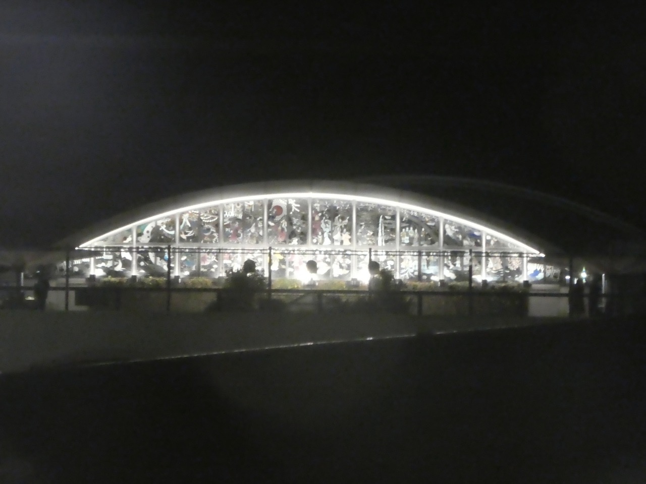 遠くて絵が小さいのでこれは便利。なお、屋上見学デッキや飛行機の中から見てもただの暗いガラス板にしかみえません。やはり屋内から見るべきものですね。- 旅行時期
