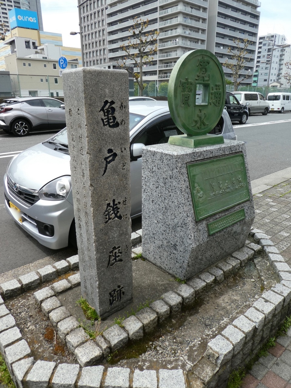 ここに江戸時代に貨幣の鋳造所があったのでした。モニュメントの下には貨幣を磨いているときの作業風景が彫ってありました。まさに人海戦術だったんですね。江戸時代の貨幣の穴が四角いのは棒を通して、周囲を磨くときに回転しないようにしたため、と知識として知ってはいたのですが、その光景を見たのは初めてでした。