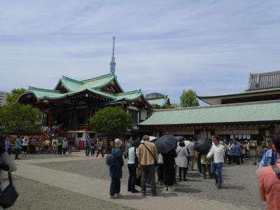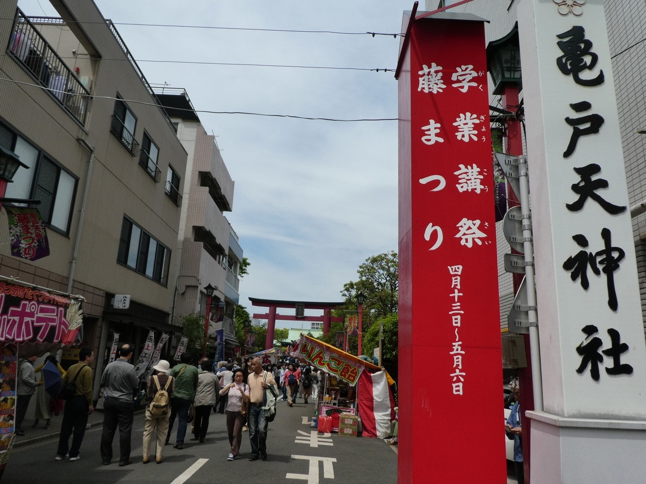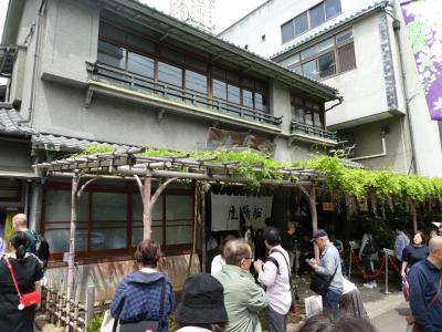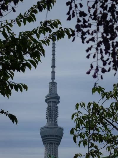藤まつりはGWころと思い込んでいたのですが、2019年のGW後半にはほぼ花が終わってました。たしかに4月中旬からの祭りまので当たり前といえば当たり前。名残のような花房がほんのわずか。それでも人出は多く、参道には出店が、有名な船橋屋の本店は行列が、太鼓橋も渡るのに列が。どなたか演歌歌手が歌ってましたがそのような行事系はあまり人が向かっておらず、みなひたすら藤の残った花を探している感じでした。それでも藤の花の間からのぞく東京スカイツリーはきれいでした。