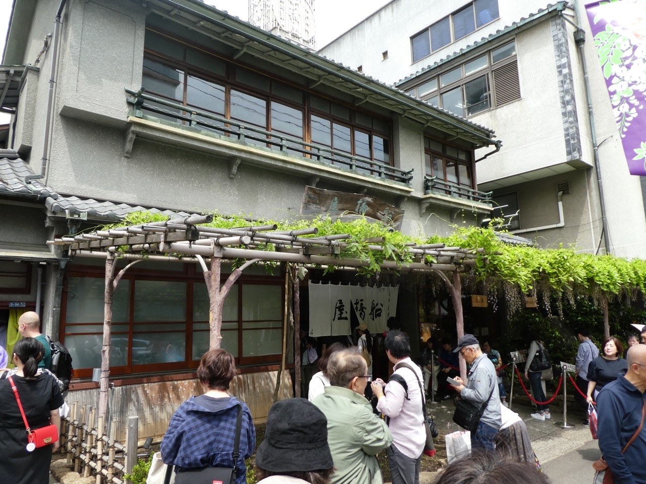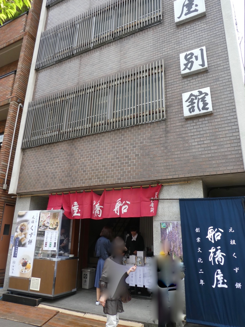 藤祭りのころ、亀戸天神の鳥居のならびにあるこの船橋屋の本店、行列です。お茶をするだけでなん十分待つのかと、お土産は別の列でそう並んでなかったです。が、それでも並ぶのいやだなあ、と思って見送り。でも帰るときバスに乗るため向かいに渡ったら、本店の斜め向かいに「別館」と書いたビルがあり、そちらで葛餅の販売をしていました。誰も並んでおらず、すぐに購入できました。