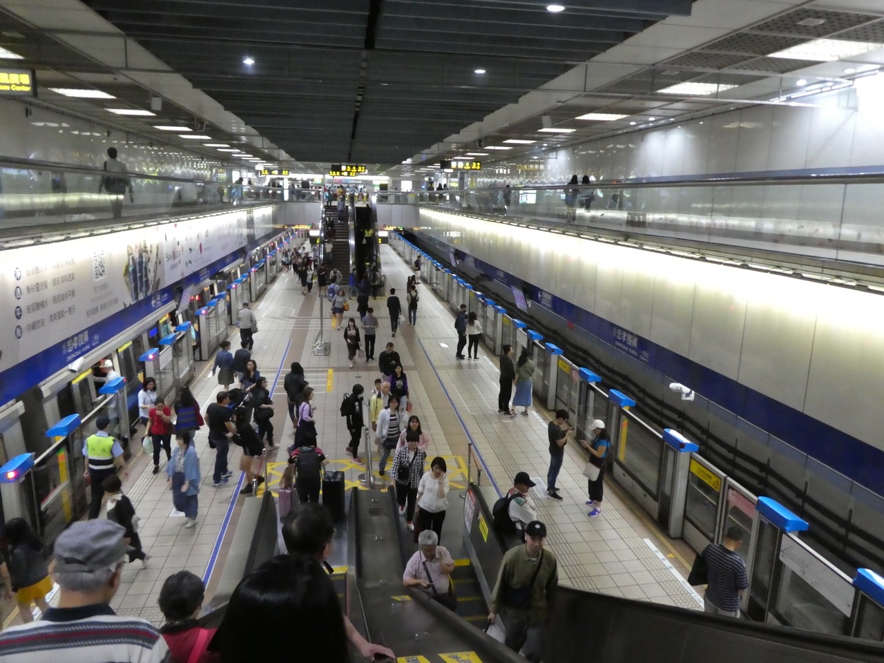 ホームは地下です。コンコースが3本あるので出口もいっぱい。とくにMRT淡水信義線に乗り換える場合は普通の上にあがる出口ではなくて、ホームから下に降りる一番東側の出口を使うと、目の前がMRTの改札口でとても乗り換えが楽です。- 旅行時期