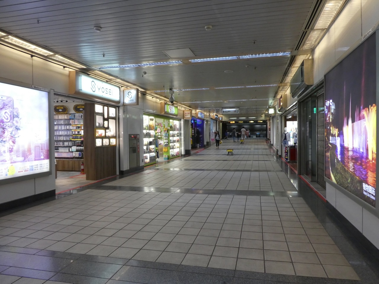 台北には駅間が地下街になっているところが数カ所。MRTに乗車するより歩いた方が早くて、また現地のお店のウインドウショッピングも楽しめるのでけっこうおすすめです。板南線のこの両駅の間は電車で1分。なので1kmはないですが、歩いてみると長いです。忠孝敦化駅側をちょっと歩きましたが、昼前ですが、静かな印象で中心は西側の忠孝復興駅の方なのかもしれません。南北方向にも出口が多いので暑いときには地下をいくのが便利。ただ、出口のお店のない通路のあたりはあまり涼しくなかったです。