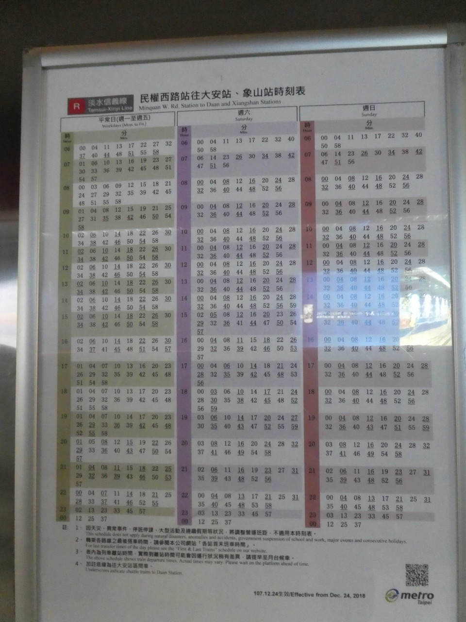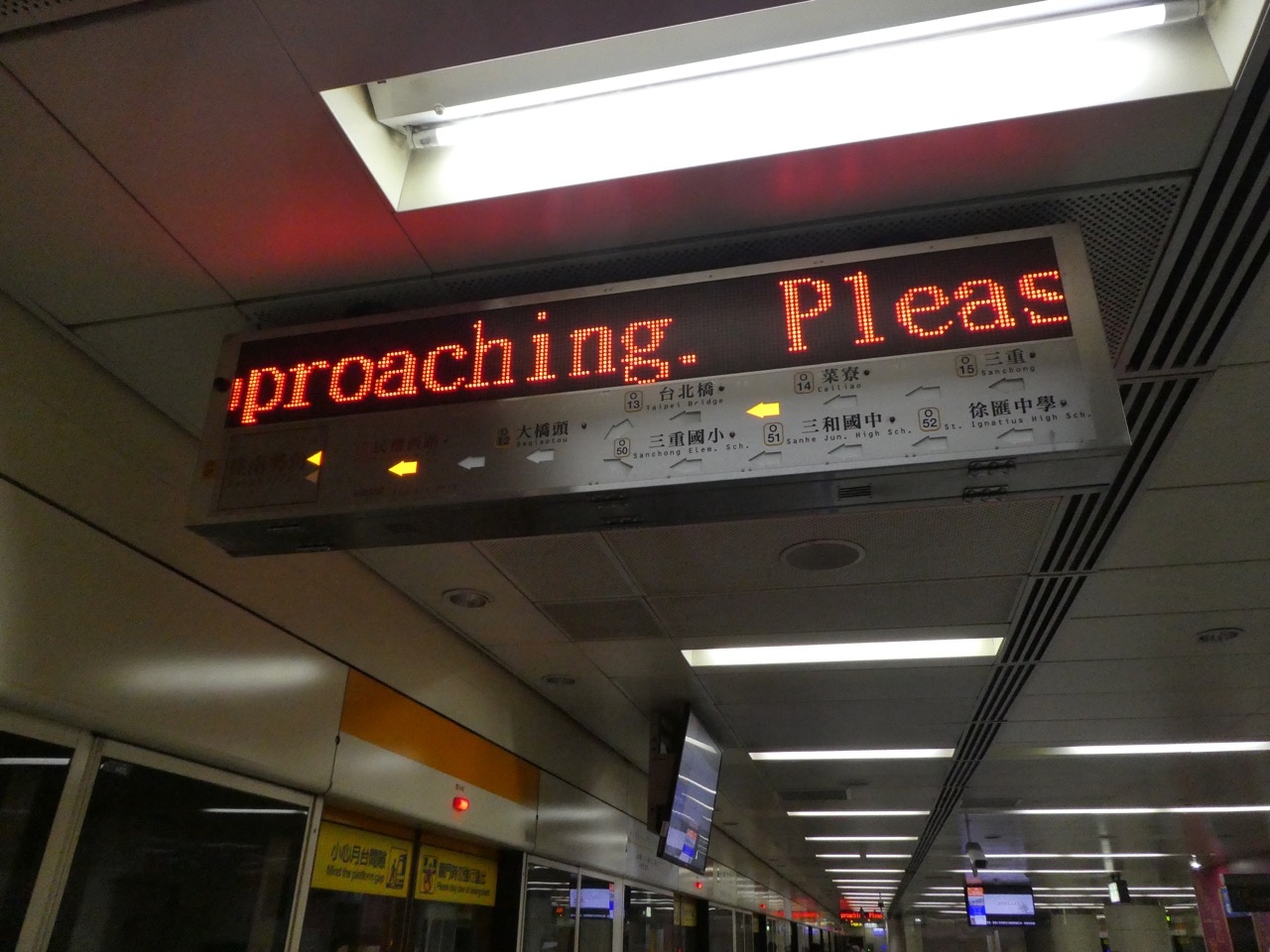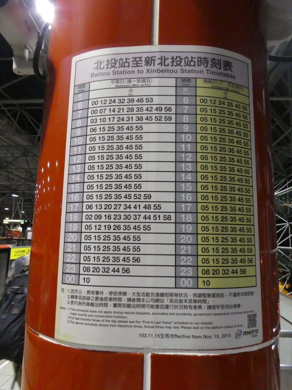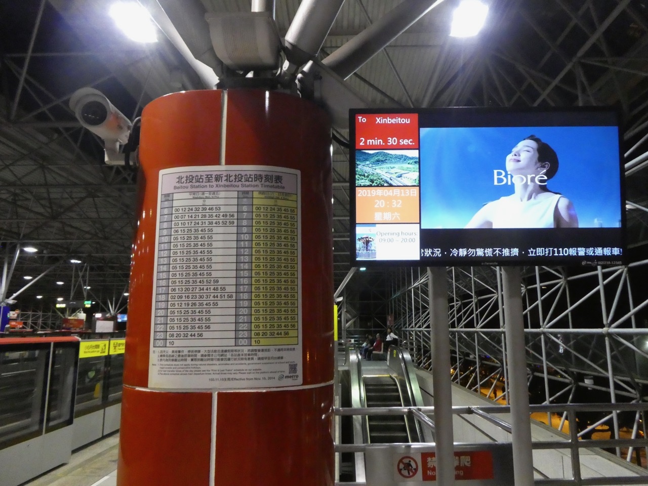 淡水信義線はホームに広告液晶があって、日本の都営地下鉄や都電のCMが流れたりするので待つ時間も飽きませんでした。時刻表が貼ってあり、昼間は3~4分おきでした。1本ごとに北投止まりで淡水までいくのは半分でした。