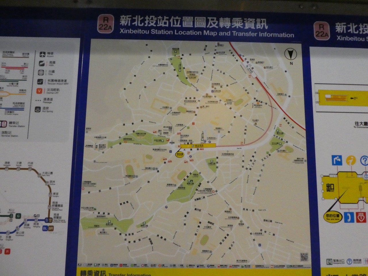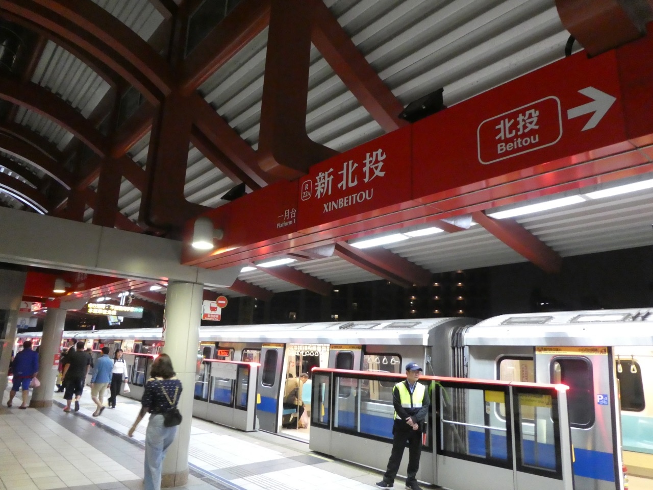 MRT淡水信義線、台北から淡水に向かうときに2/3くらいの距離の中間の駅。都心は地下鉄ですが、すぐに高架橋にあがり、この駅も高架線です。車庫のある駅なのもあって、この駅止まりの列車も半分くらいあります。北投温泉へはここで乗り換え。1駅だけの支線で新北投駅に向かいます。この駅止まりの列車があって支線もピストン輸送で編成両数も同じなら1本に繋げればいいのに、と思うのですが、本線支障(本線横断)を避けるためなどの理由があるのでしょう。支線は端っこの独立したホームで乗り換えは上下線とも階段の上り下りあり。乗り換えも対面にするとかしてくれればいいのに、と感じました。