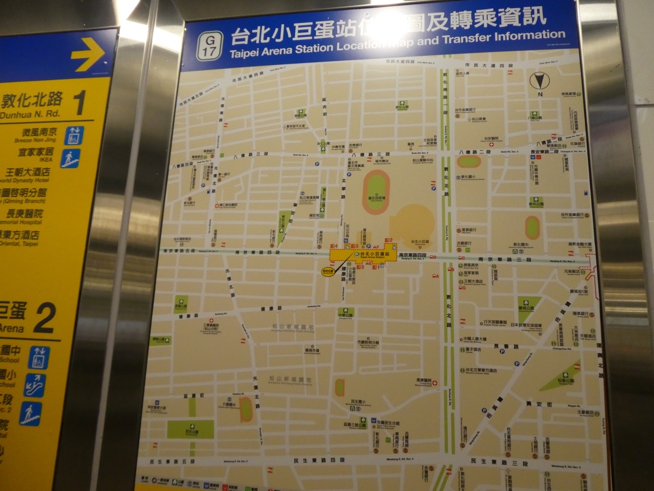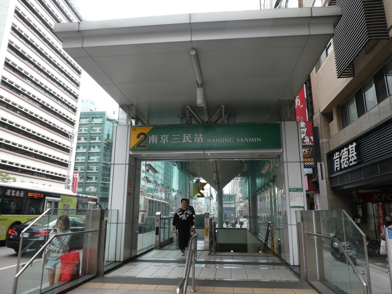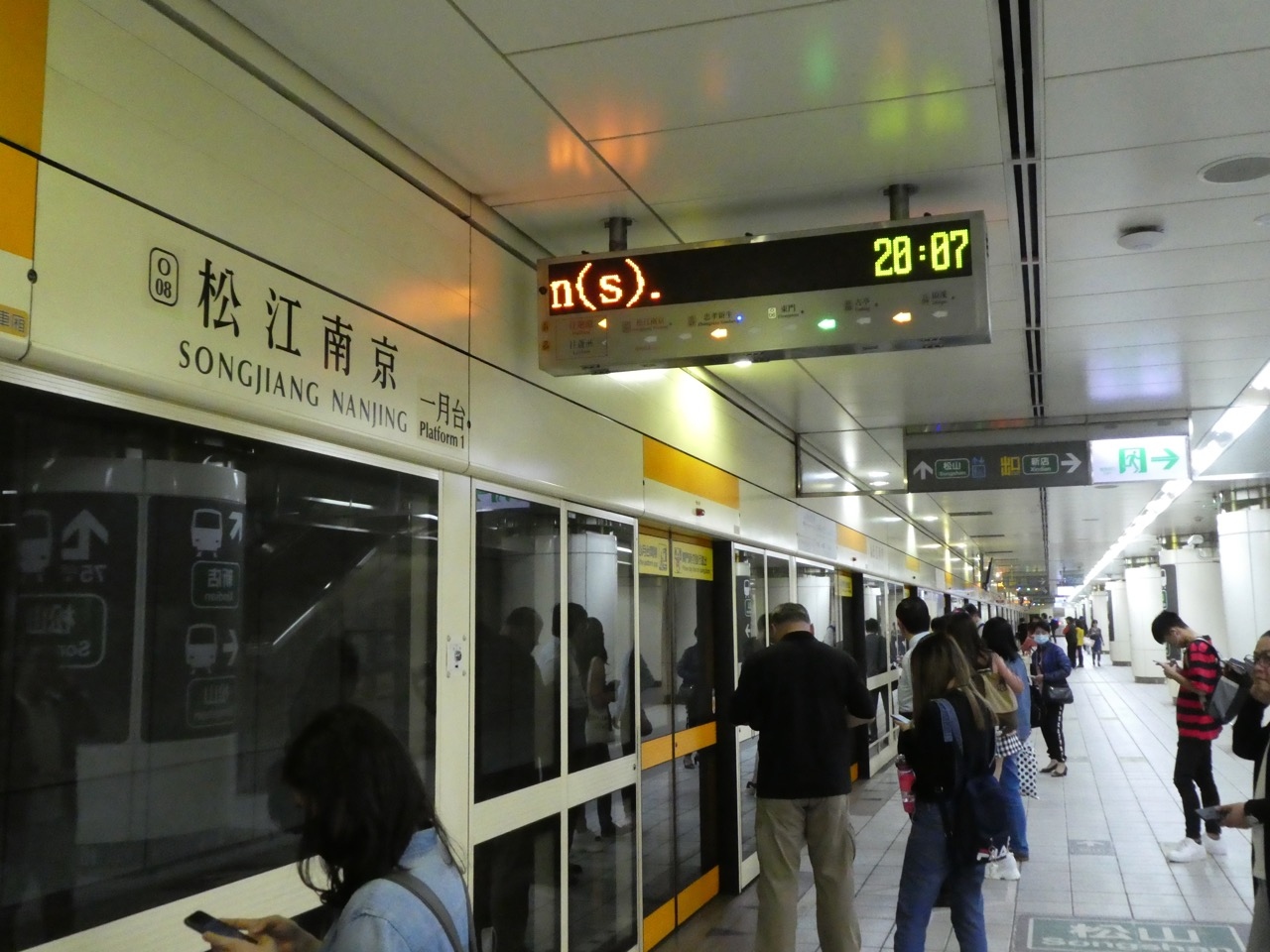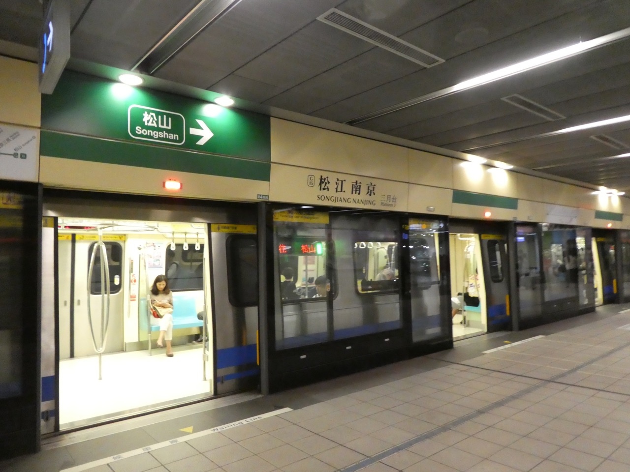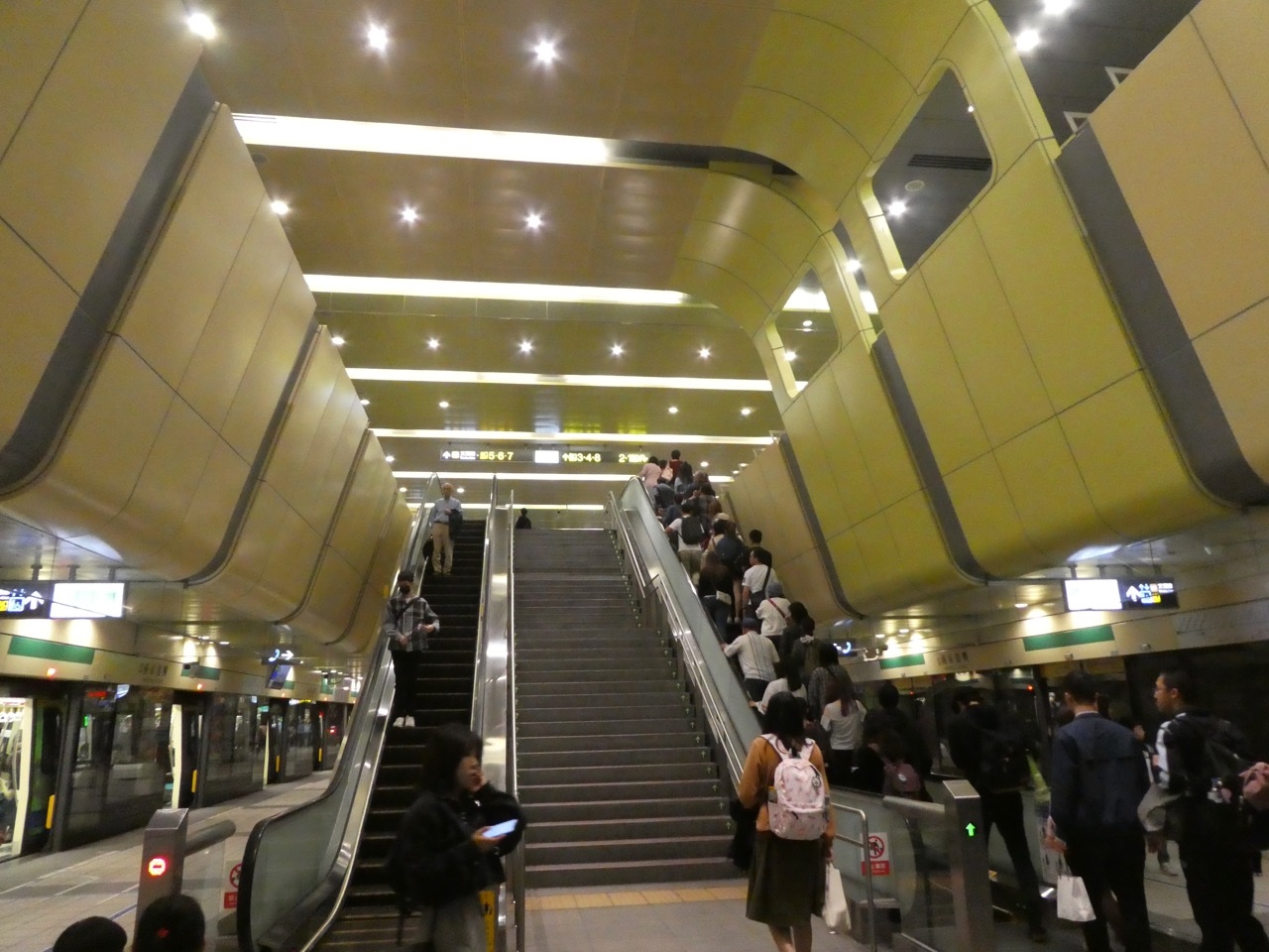 台北のMRTはここ10年で一挙に新線が開通して都心は碁盤の目のよう。赤・緑・青・橙の4路線で網の目になってます。最近は駅名は南北の通りと東西の通りの交点にあることからその両方の名前をつなげて駅名にしているところが多いです。この松江南京駅もその原則どおり。なので場所がわかりやすいです。グリーンのライン(松山新店線)とオレンジのライン(中和新蘆線)の乗換駅で、どちらも2010年以降の開業で新しいです。なのでホームもやや広く感じます。オレンジのラインは地下深く、地上からだと乗車に時間がかかります。でも乗り換えはあまり水平移動がなく、シンガポールのMRTと比べたらかなり楽です。