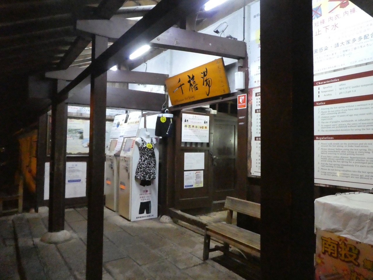 MRTの新北投支線の終点、新北投駅からすぐ。路面の下の排水溝の蓋から温泉の湯気が出てたりして雰囲気は温泉街。
