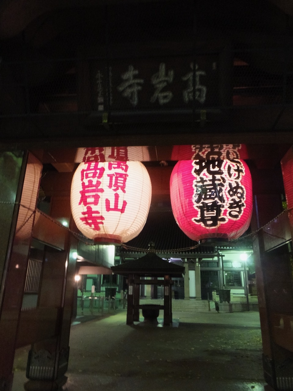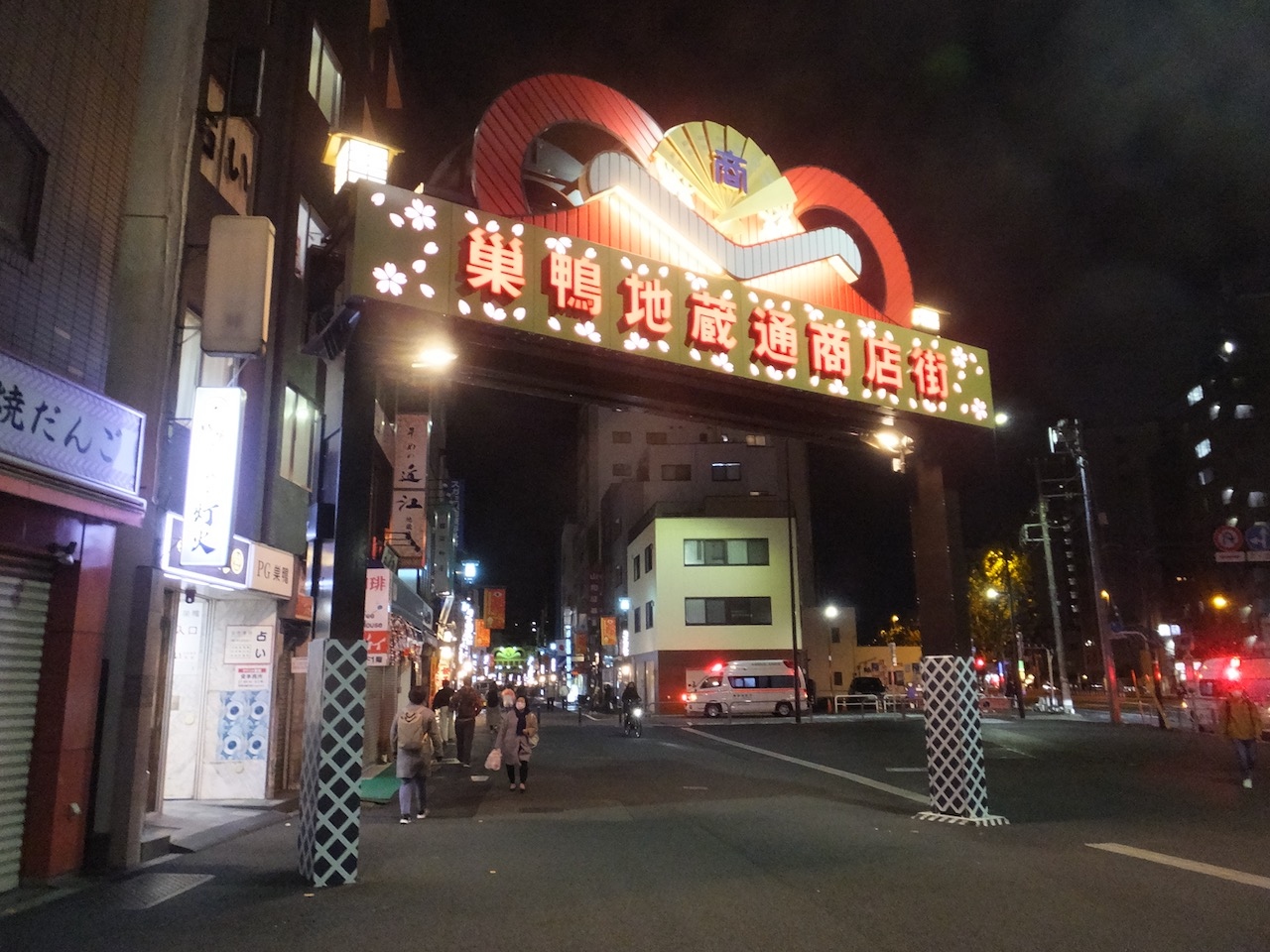 巣鴨のホテルに泊まったので夜、散歩で参拝にでかけました。商店街に沿って境内があり、提灯も明るく、石畳に光が反射して明るい広い境内。夜でも参拝客が数名。安心しました。