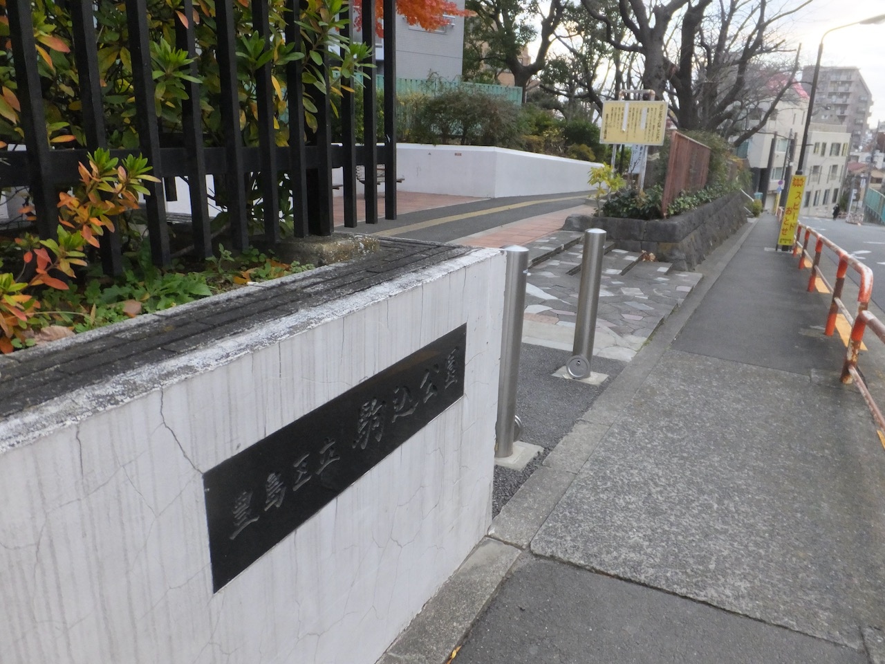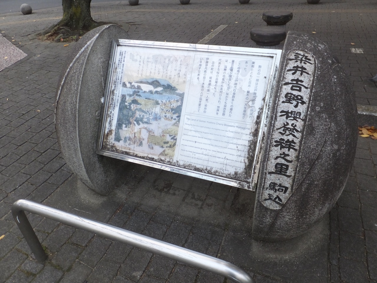 となりの駅の巣鴨駅の近くにも「染井吉野の碑」がありますが、こちらにも「染井吉野発祥の地」の碑があり、こちらの方が解説つきで立派です。なお、公園自体は桜の木以外はコンクリタイルが敷き詰められた都会の公園で、とくに変わったところは見られませんでした。ただ、公園のどこかに駅前の駒込橋の架け替え前の先代の欄干が保存してあると知り、次回の訪問時にはちゃんと探そう、と思いました。- 旅行時期