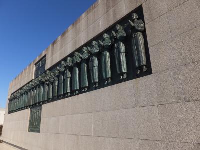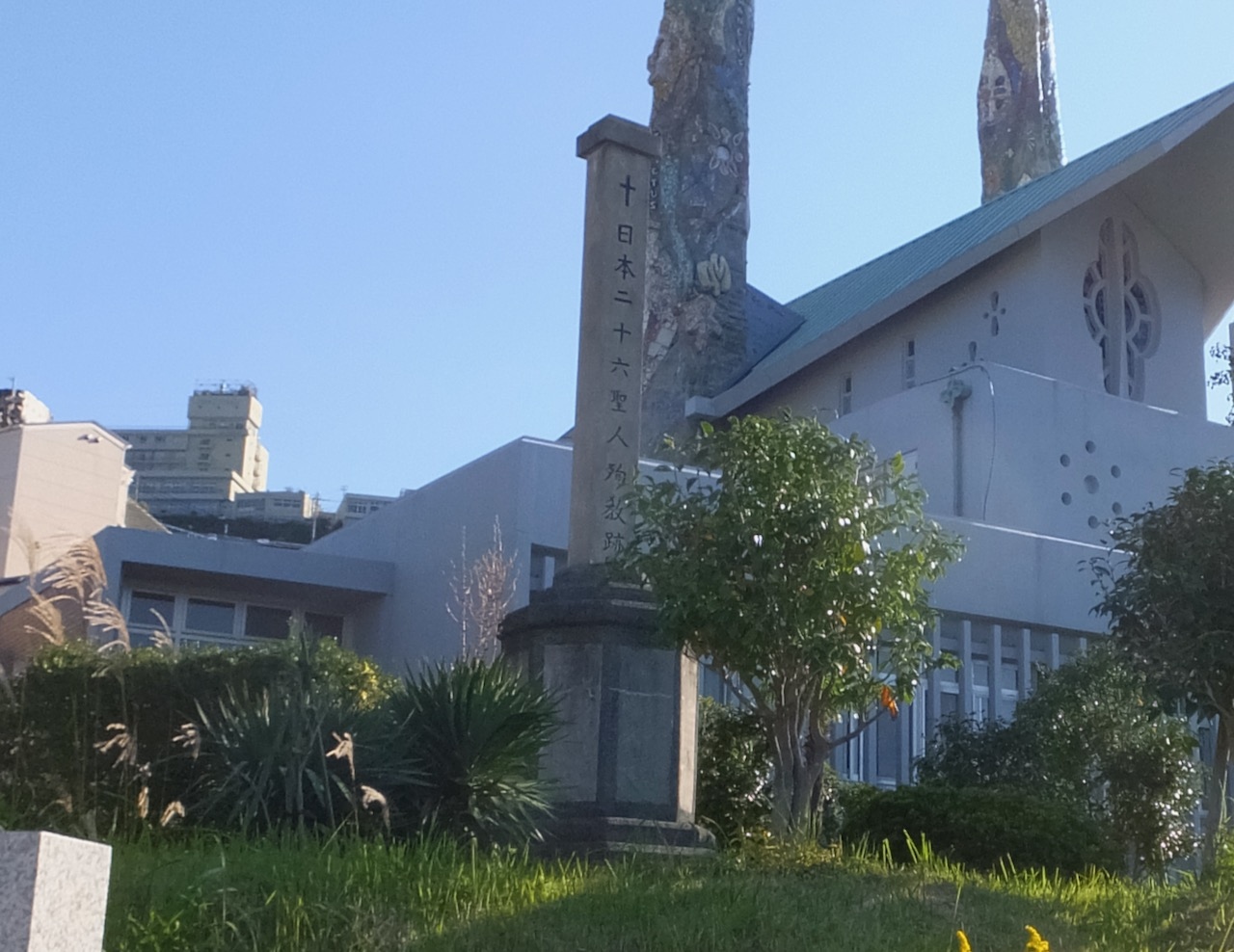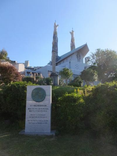 なお、横長の26人のレリーフが記念碑。その向こう側が記念館です。26聖人殉教の地の石碑はとなりの日本二十六聖人記念聖堂 (聖フィリッポ教会)の方にもありました。