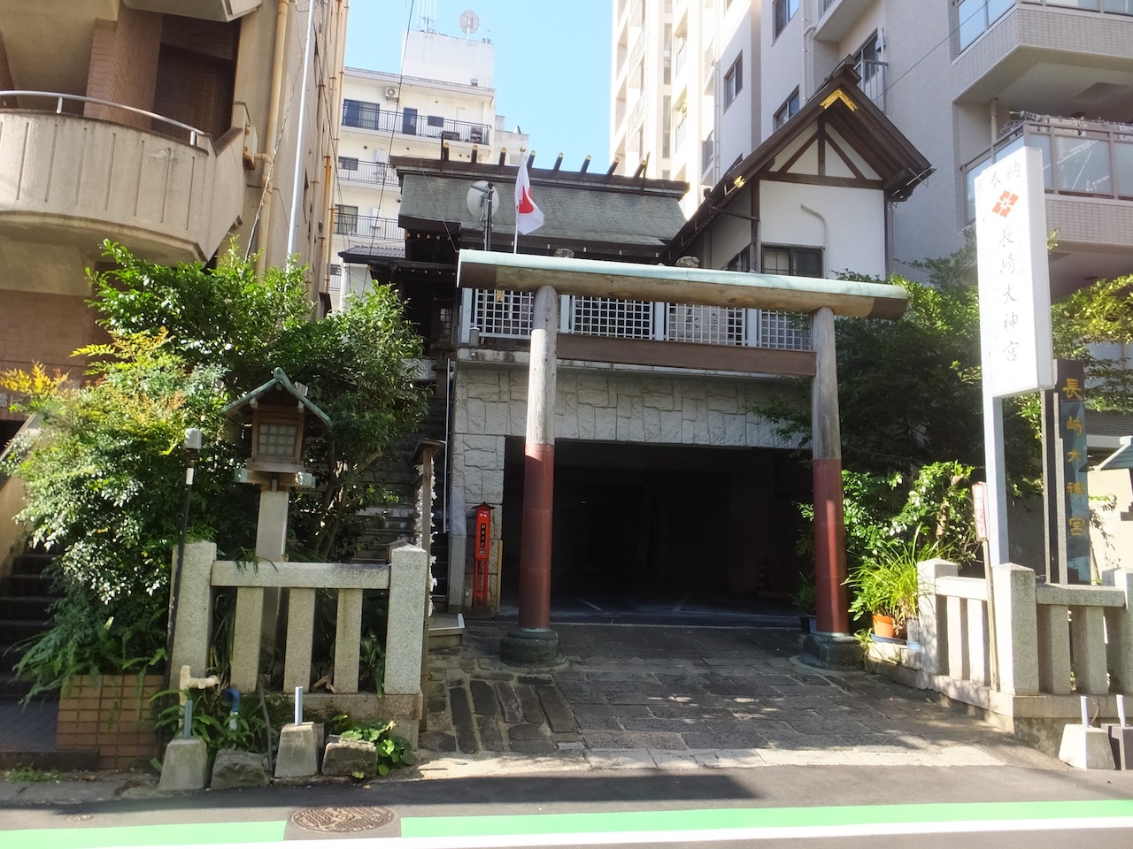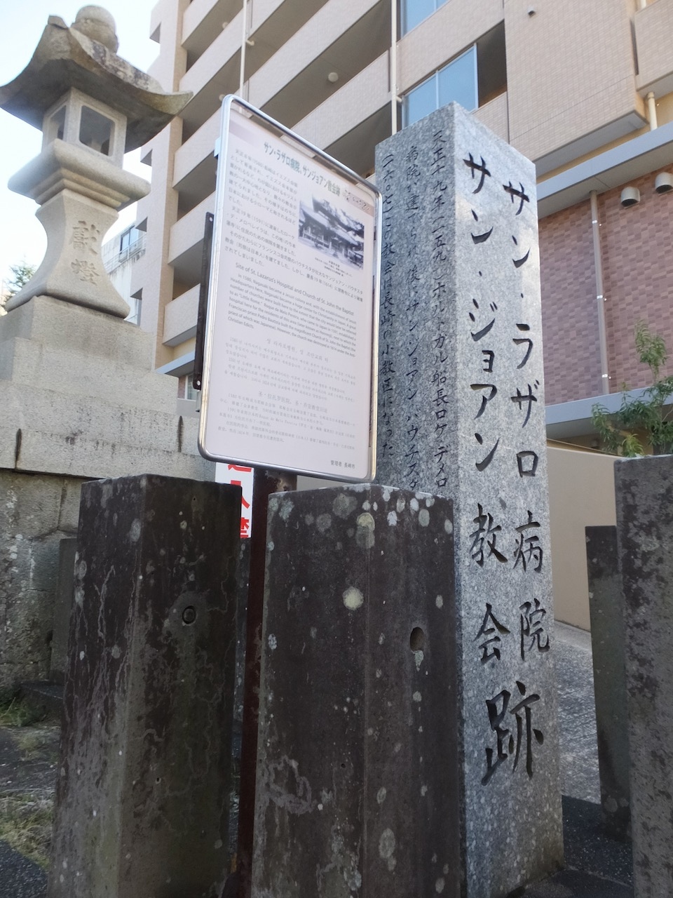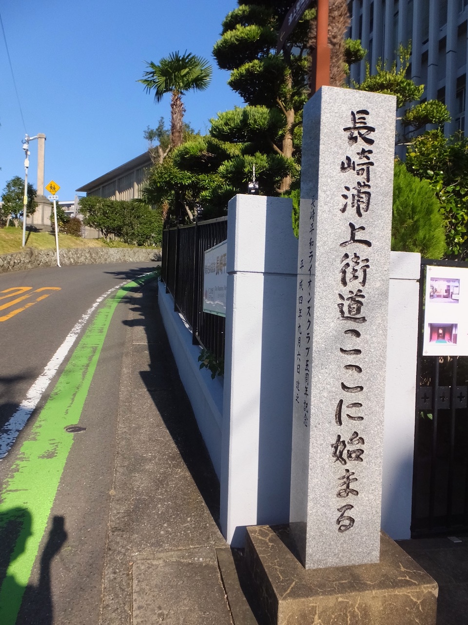 長崎駅前の丘を坂道で登った西坂公園の中にあります。坂道と階段で疲れるので心構えが必要です。